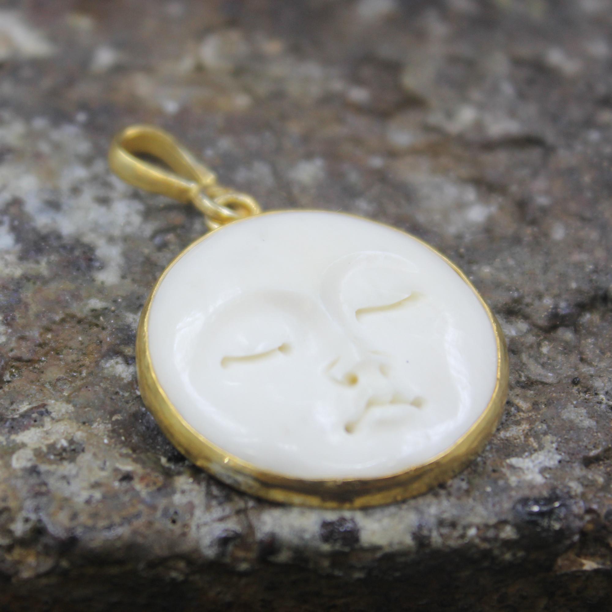 The carving is framed in 925 sterling silver, richly finished with 24K gold vermeil, giving it a warm golden glow while maintaining durability. Each pendant is handmade, ensuring that no two pieces are ever exactly the same—making yours truly one-of-a-kind.