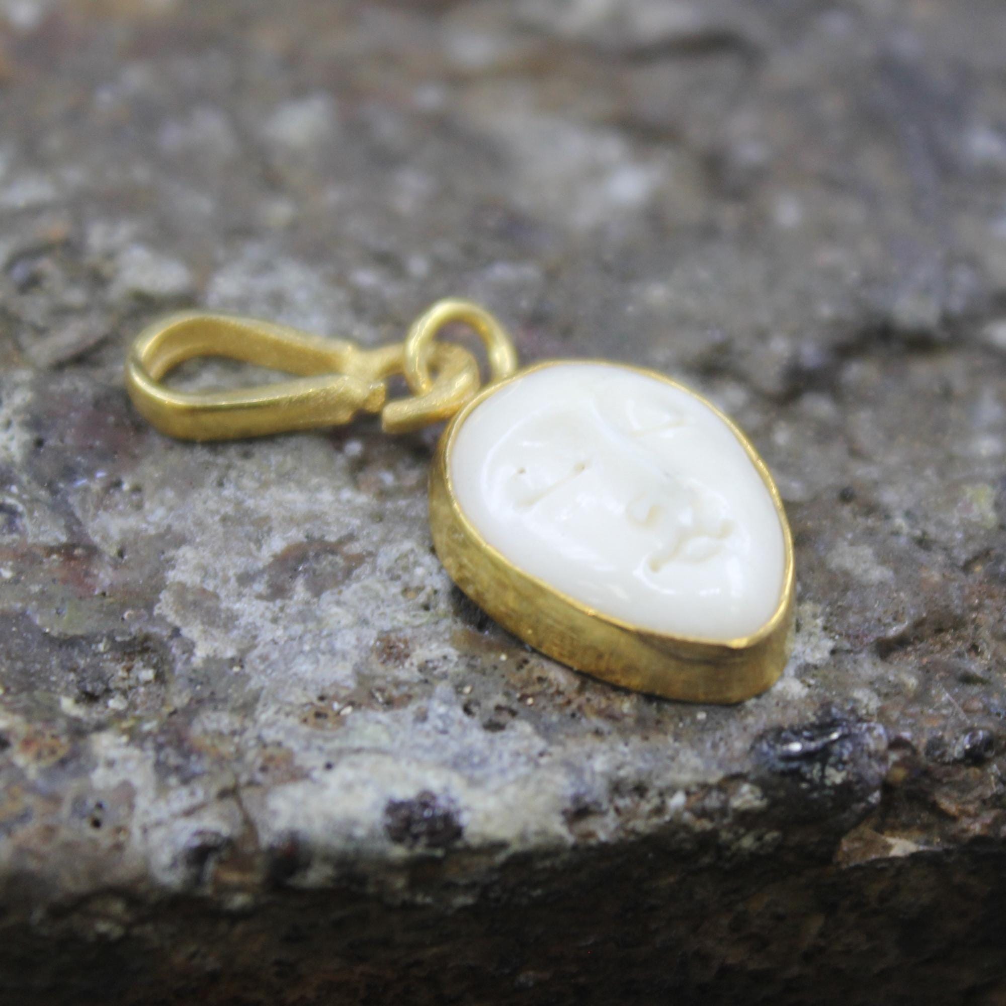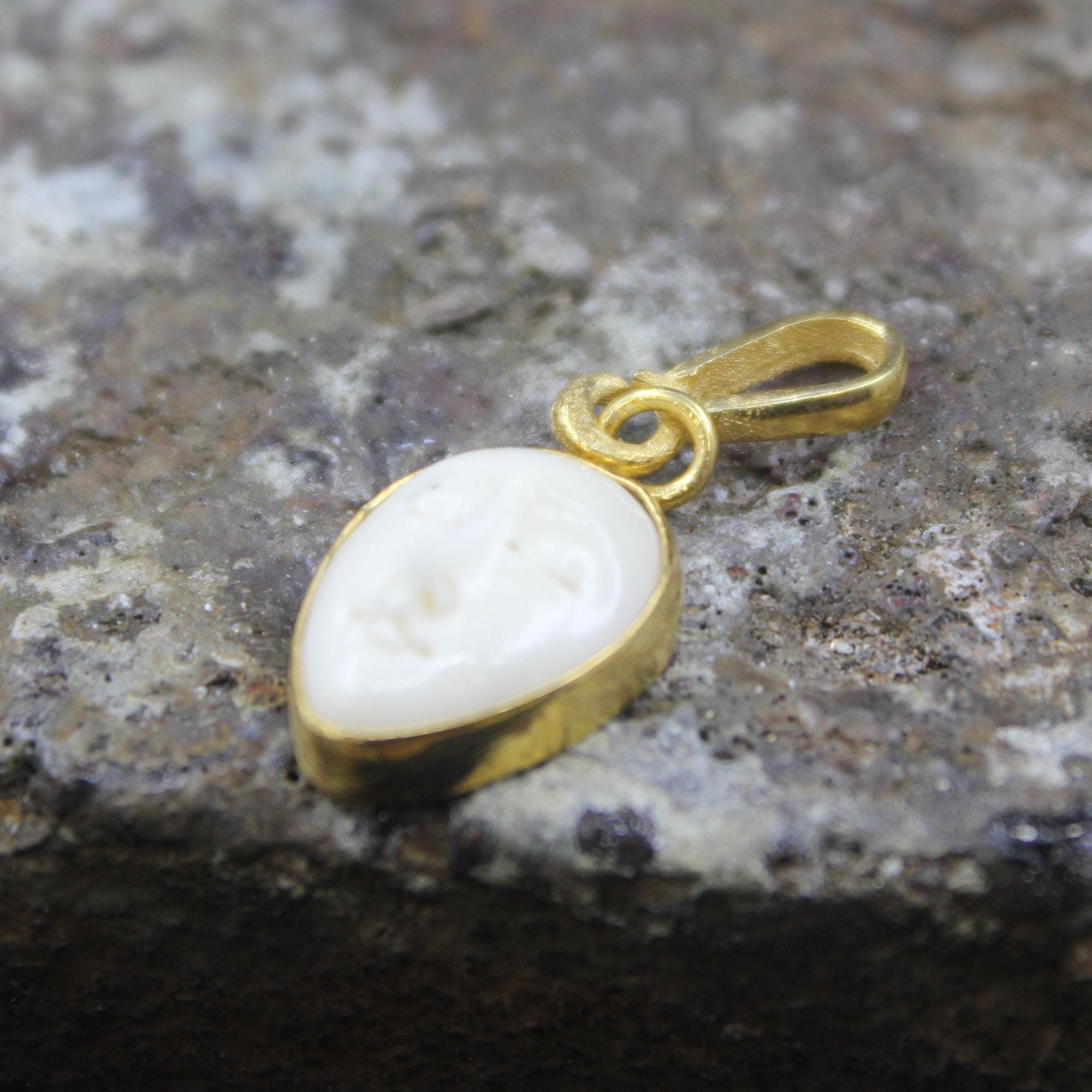 The carving is framed in 925 sterling silver, richly finished with 24K gold vermeil, giving it a warm golden glow while maintaining durability. Each pendant is handmade, ensuring that no two pieces are ever exactly the same—making yours truly one-of-a-kind.