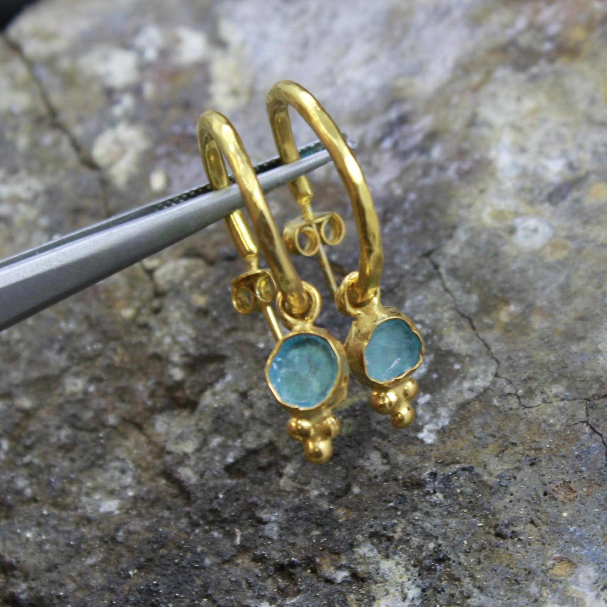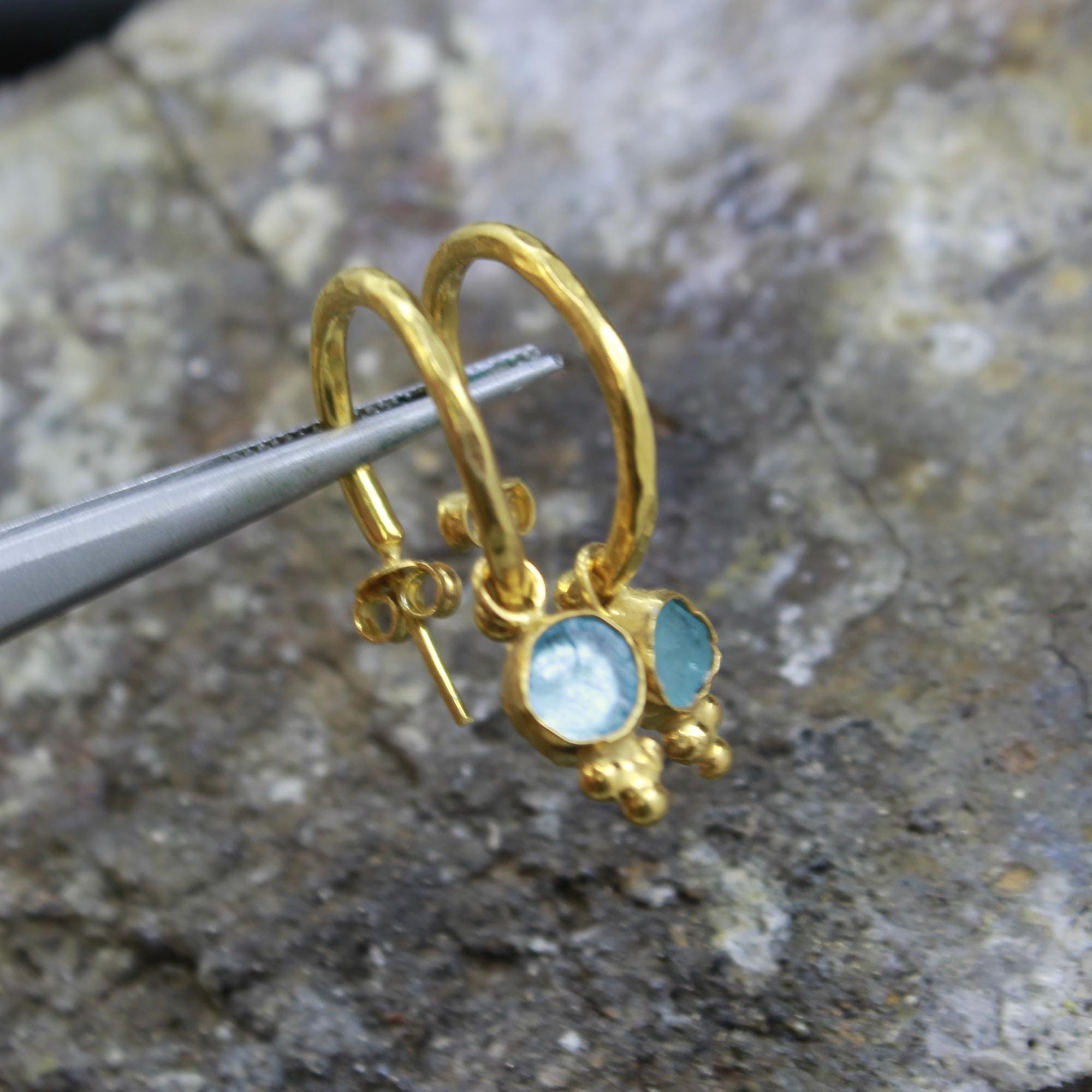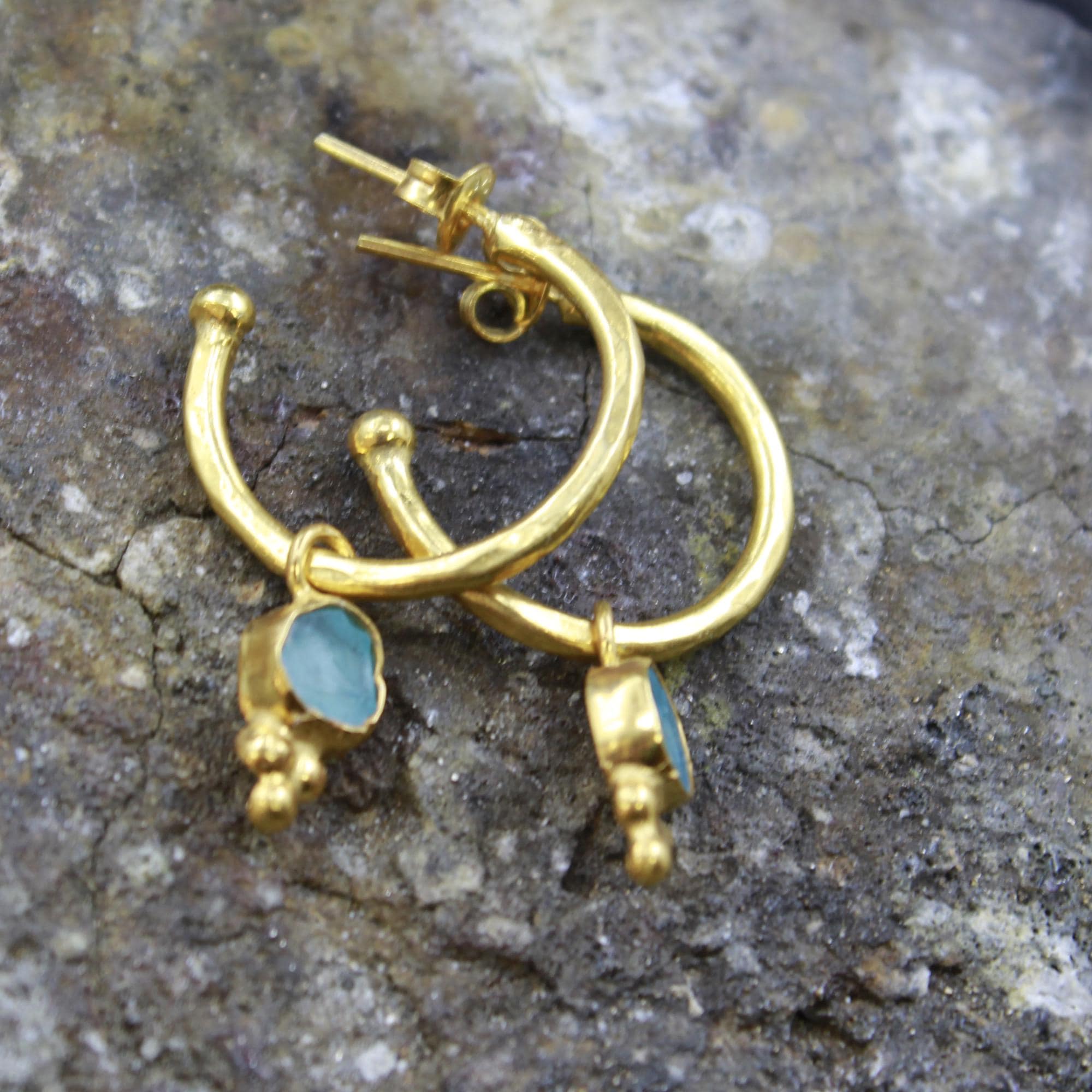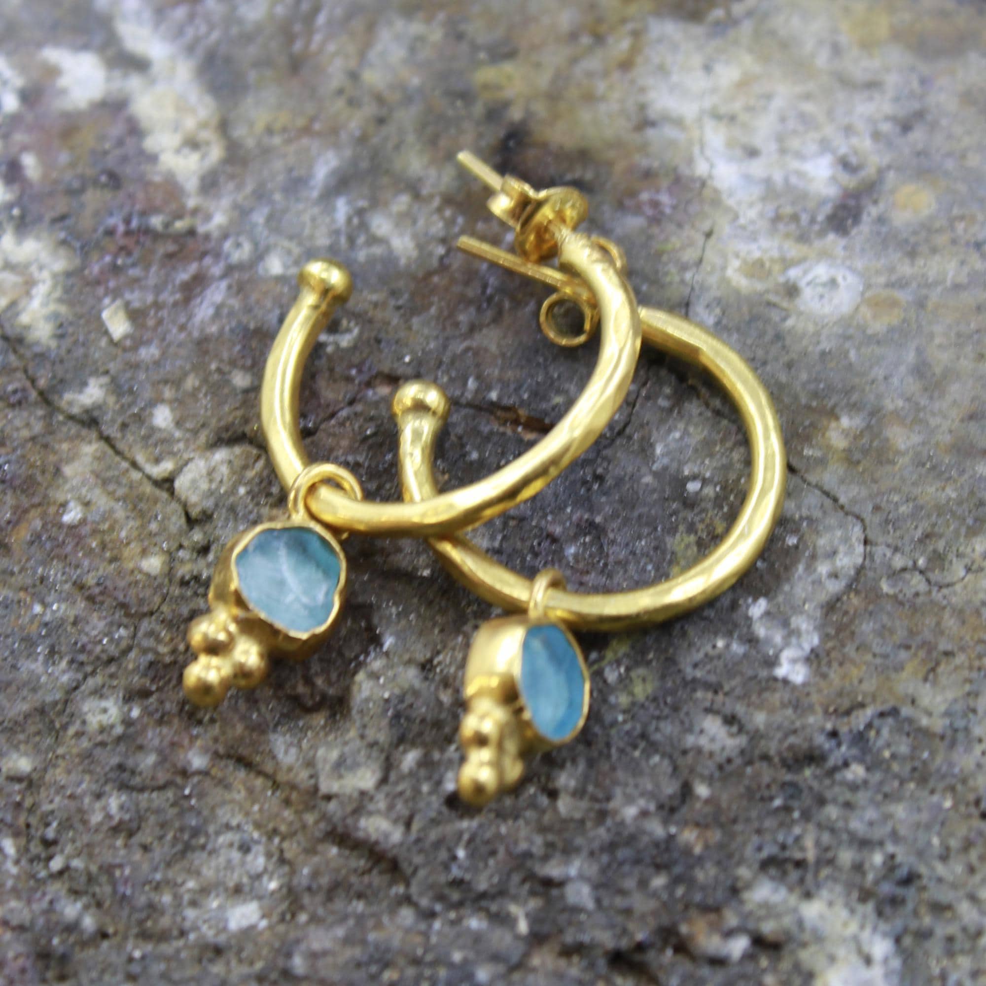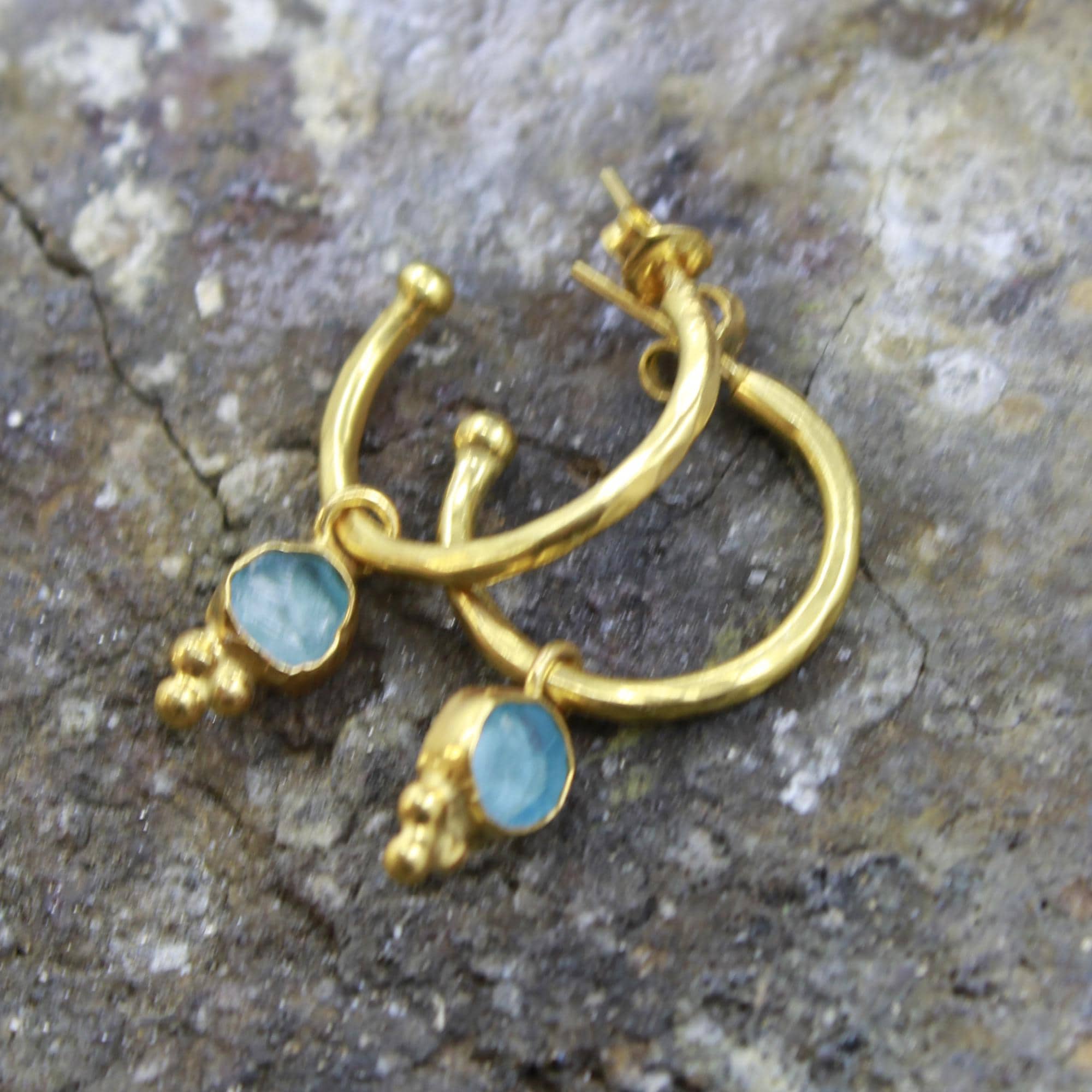 Bring a touch of ocean elegance to your style with these handmade natural raw aquamarine hoop earrings. Crafted from solid sterling silver plated in luxurious 24K gold, each pair showcases genuine uncut aquamarine stones — loved for their soft, serene blue color and calming energy.