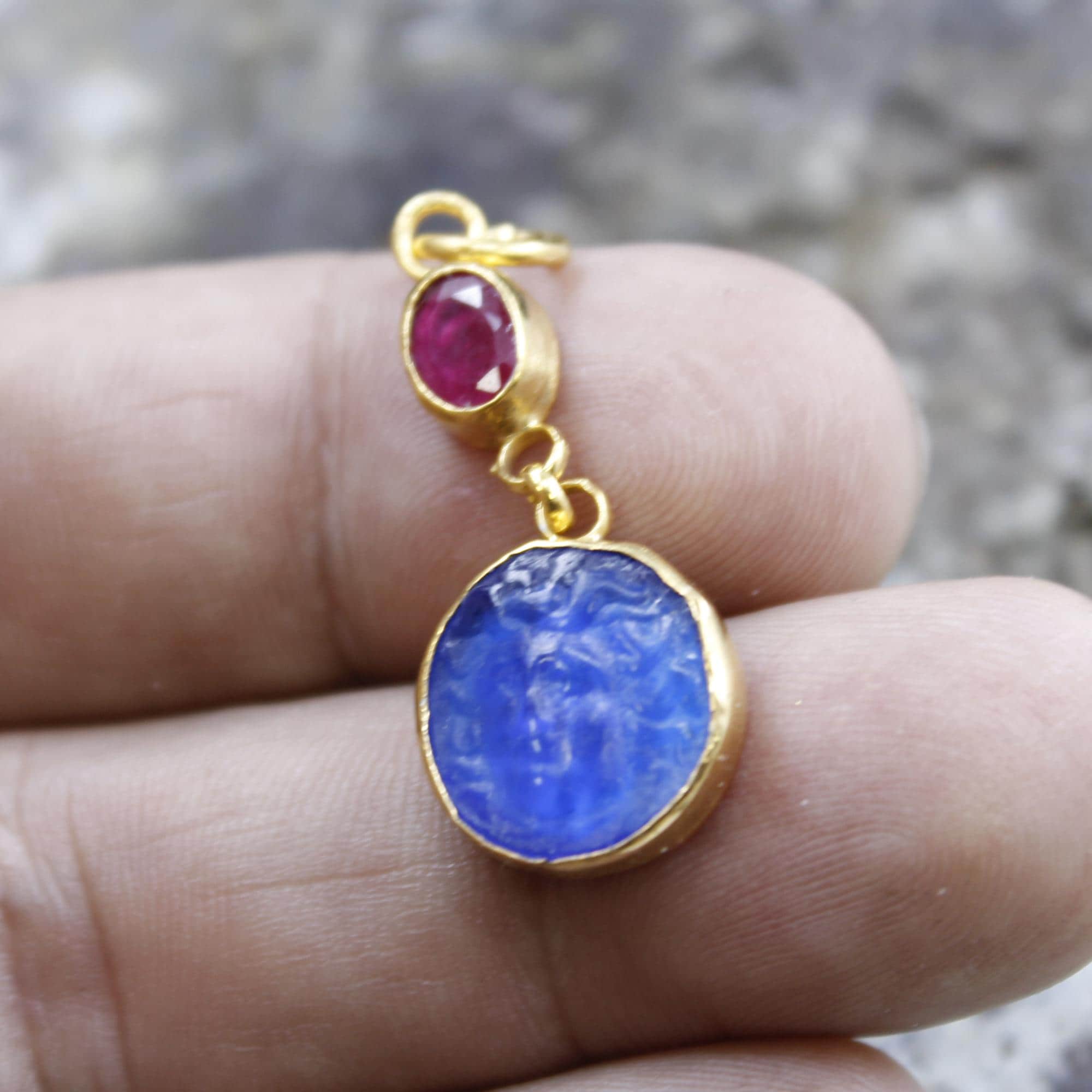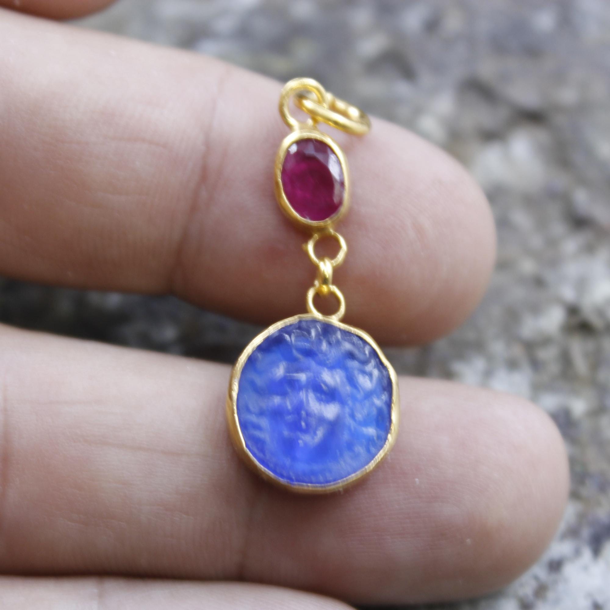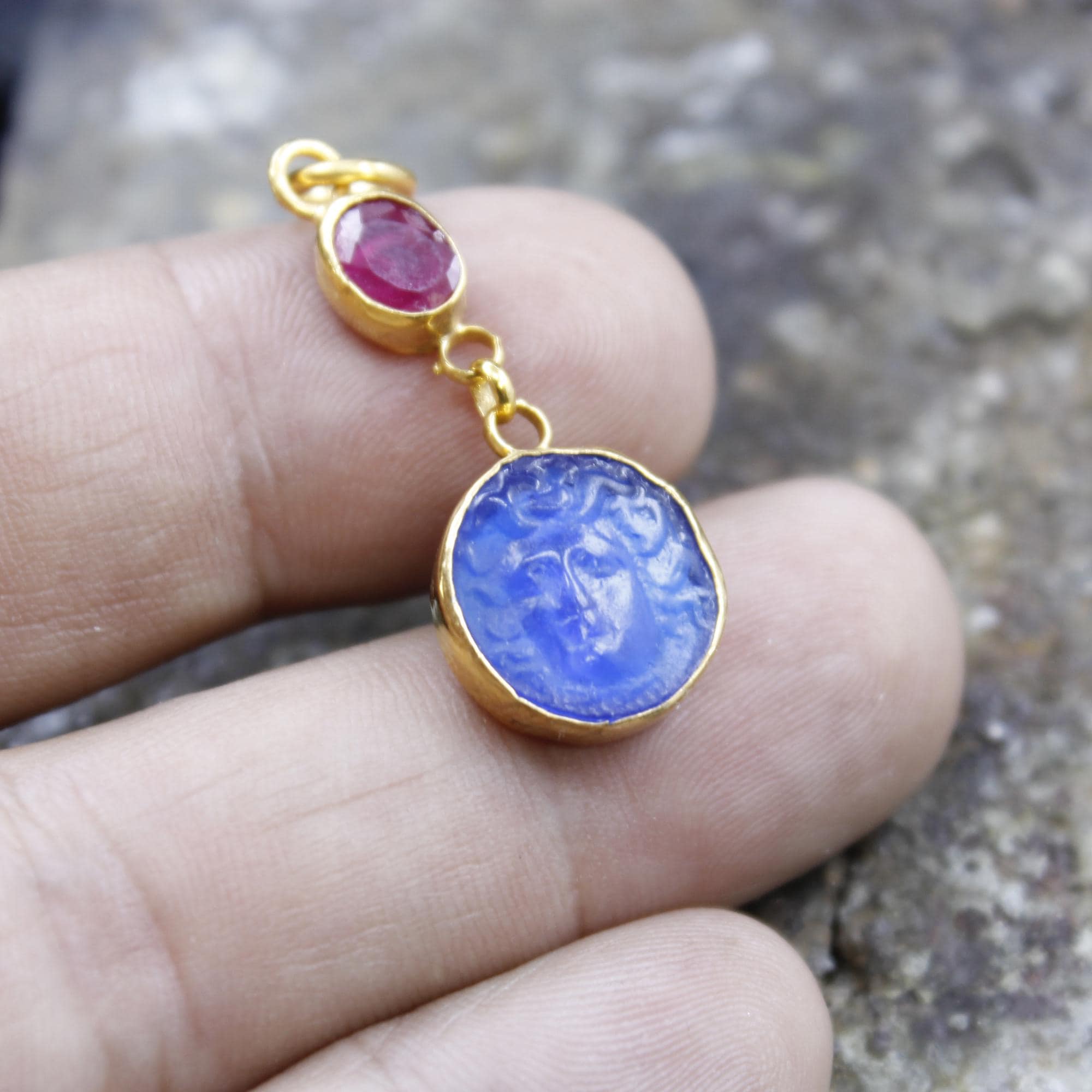 METAL: 925k Solid Silver and Bronze coin GEM: Lab Created Ruby Intaglio Size: 13 x 13 mm Stone Size : 7 x 5 Pendant Length : 37 mm Finish : Yellow Gold Vermeil , Solid Silver Finish, Rose Gold Vermeil