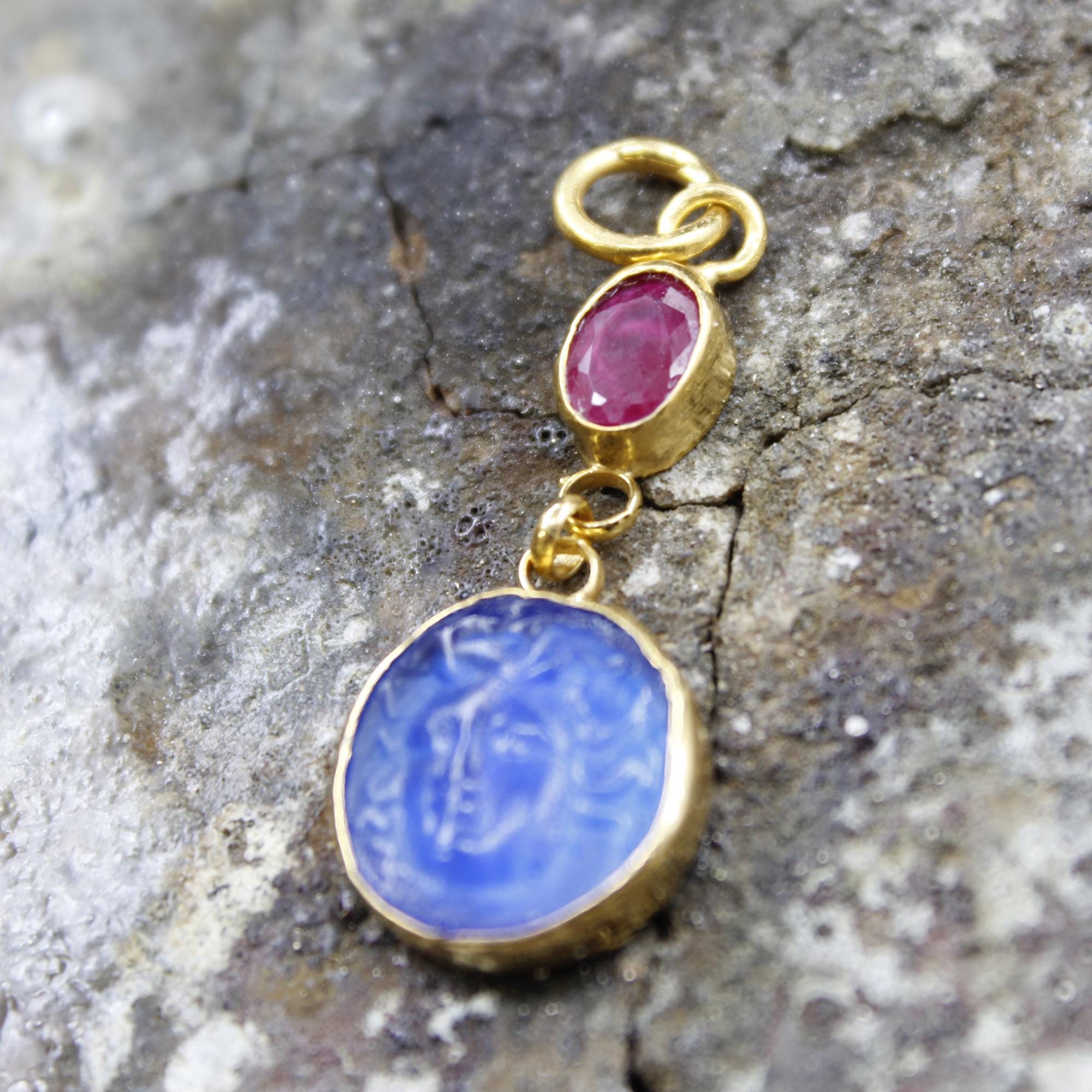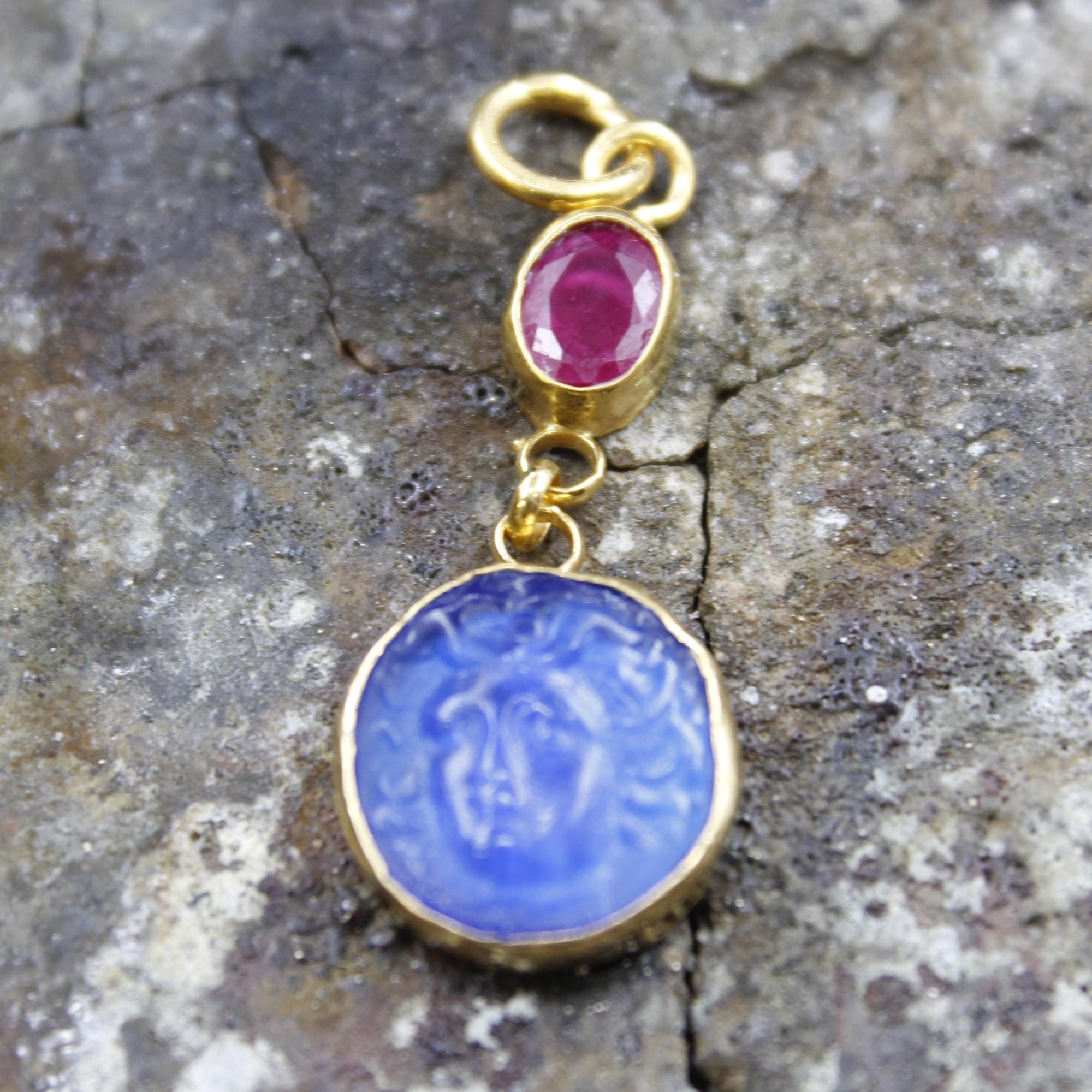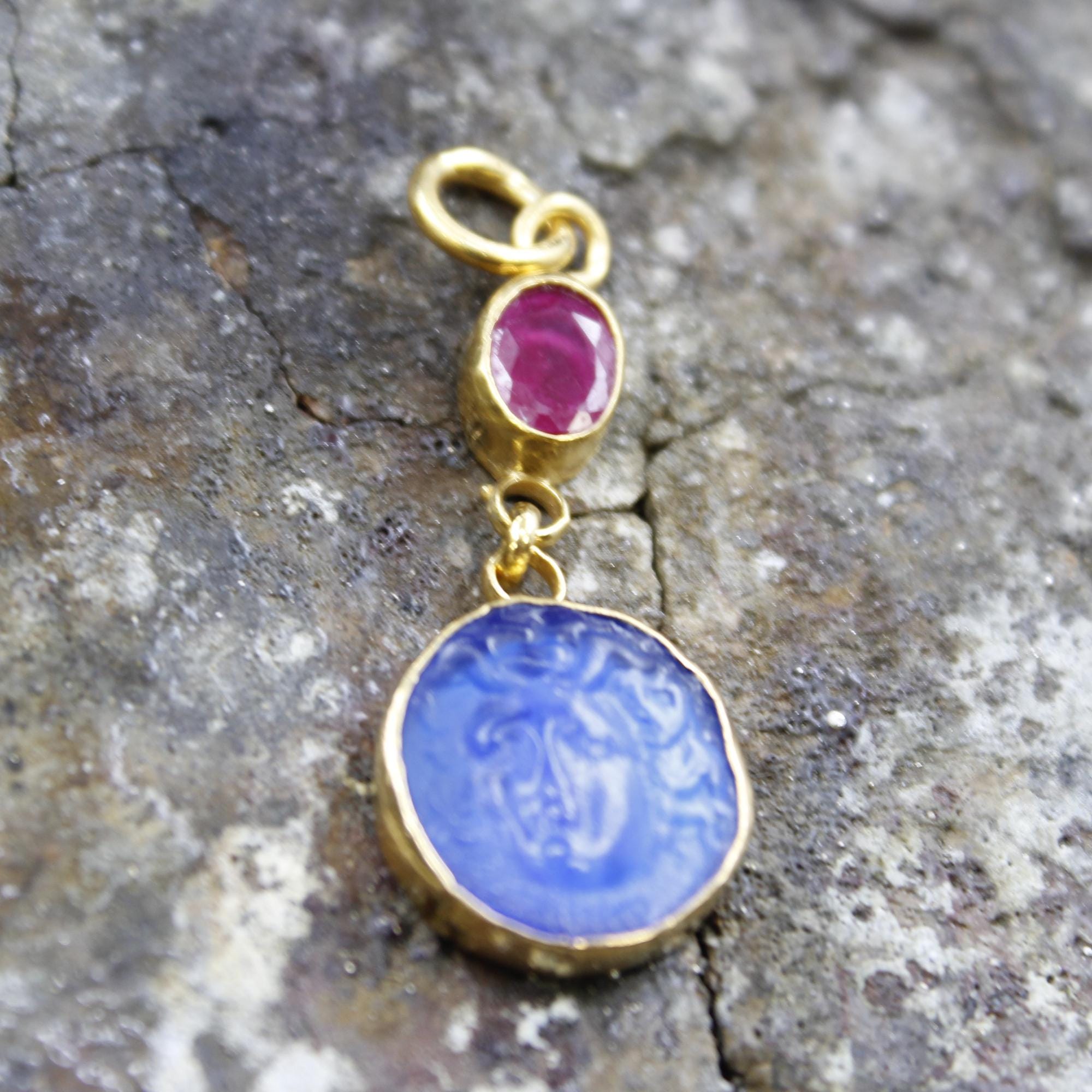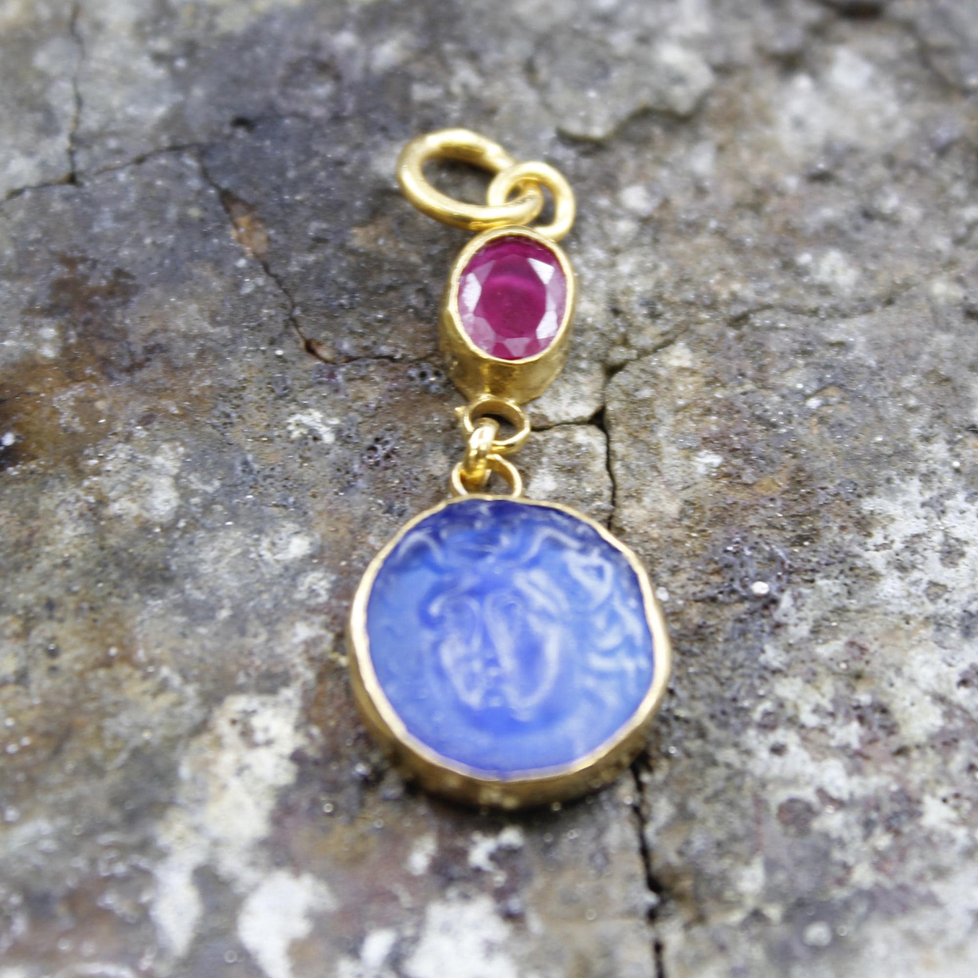 METAL: 925k Solid Silver and Bronze coin GEM: Lab Created Ruby Intaglio Size: 13 x 13 mm Stone Size : 7 x 5 Pendant Length : 37 mm Finish : Yellow Gold Vermeil , Solid Silver Finish, Rose Gold Vermeil