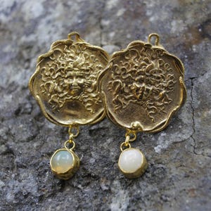 METAL: 925k Solid Silver GEM: Bronze intaglios and Natural Raw Apatite intaglio Sizee: 13 x 13 mm Apatite Size : 5 x 5 mm Earring Length : 43 mm Finish : Yellow Gold Vermeil , Solid Silver Finish, Rose Gold Vermeil