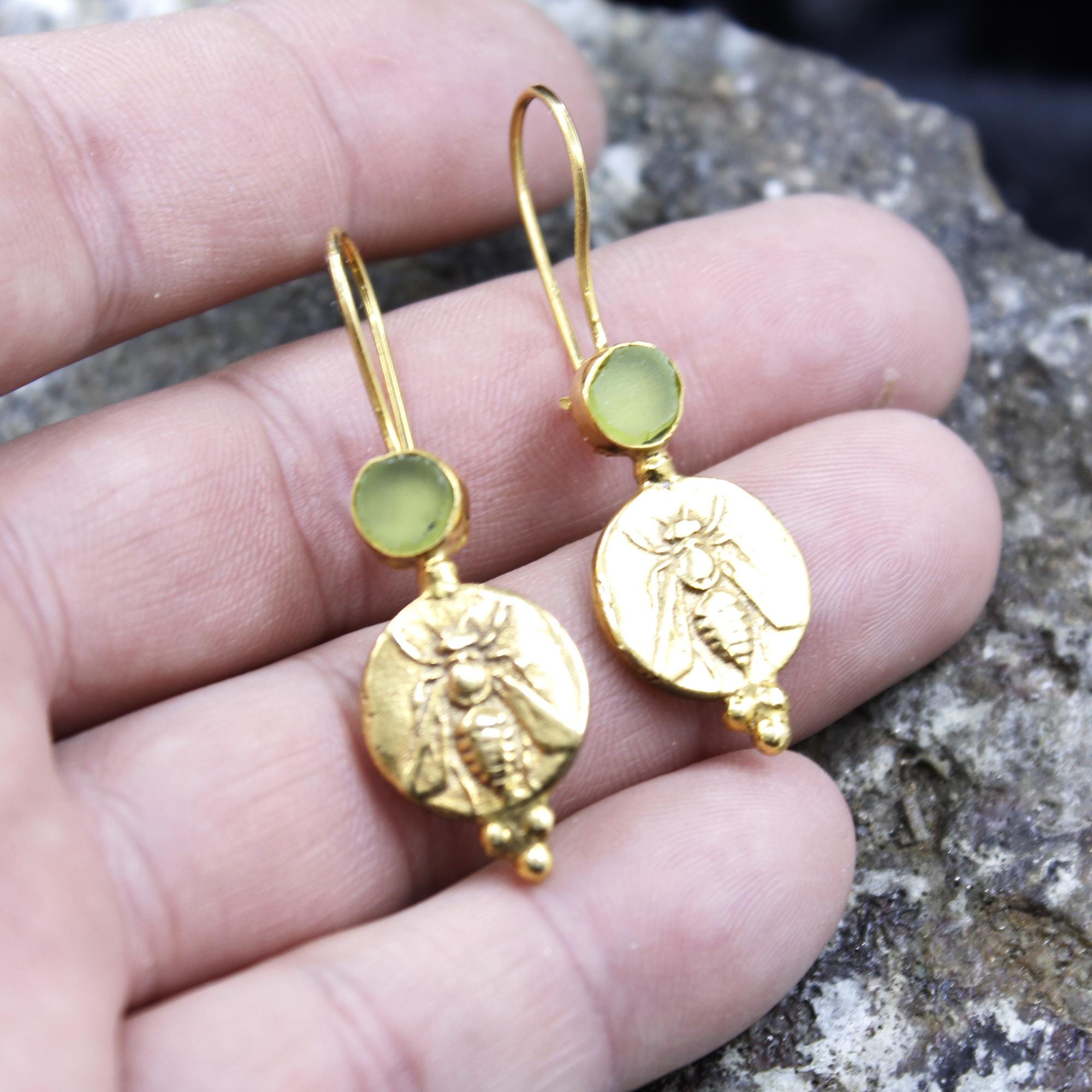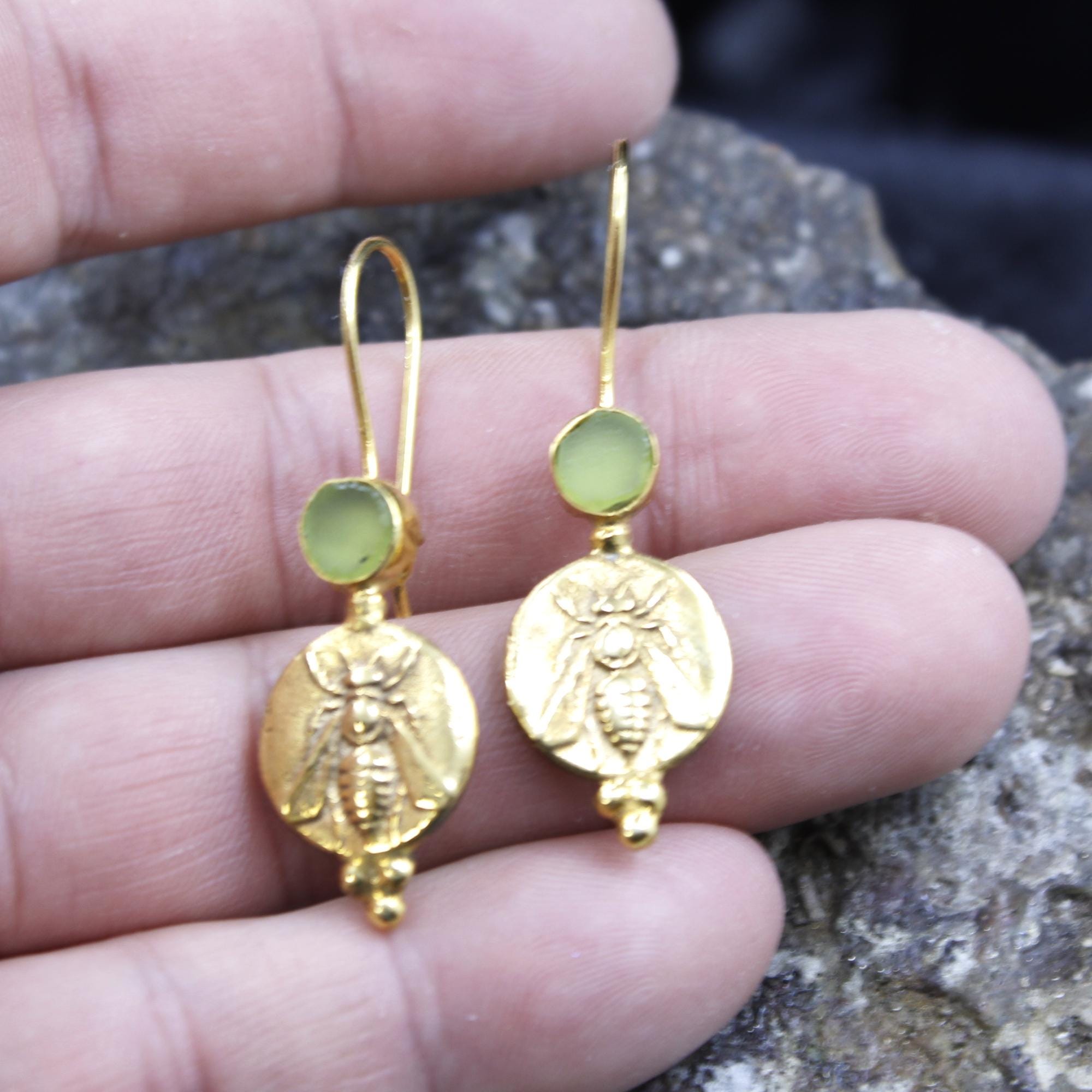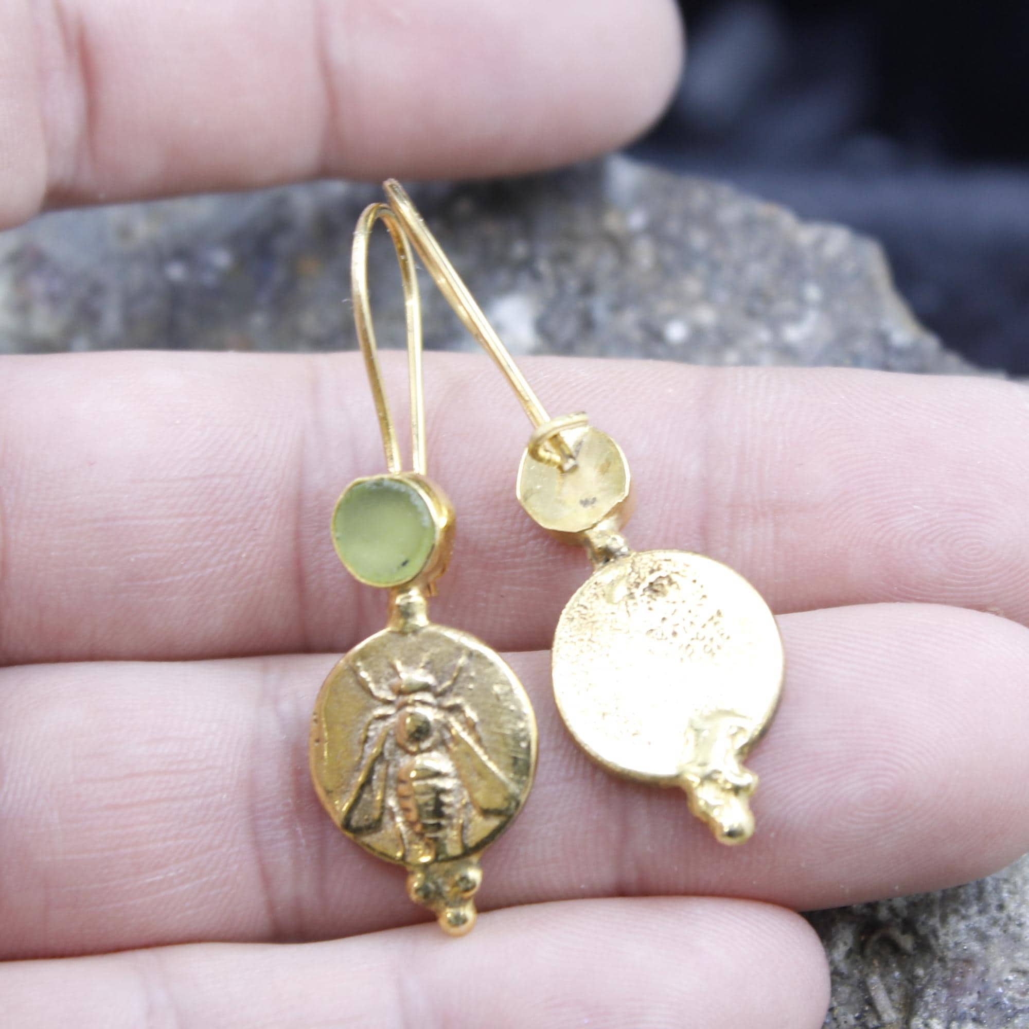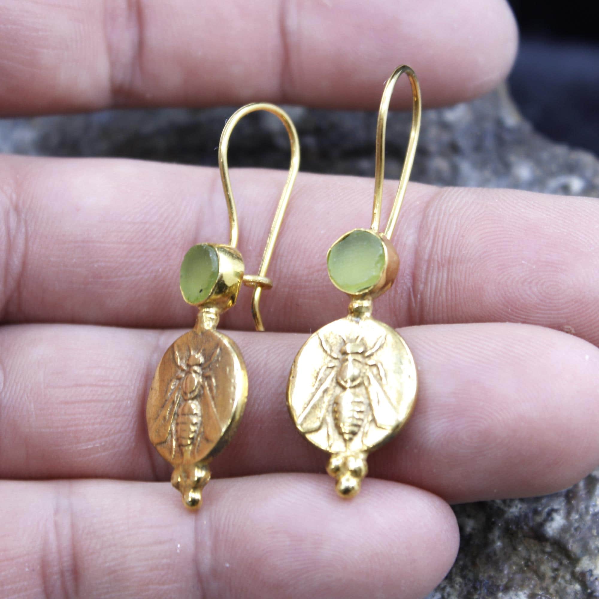 Embrace nature’s charm with these exquisite Bronze Honey Bee Intaglio Earrings, featuring delicately carved bee motifs paired with natural raw Apatite gemstones. Each piece is handcrafted with care in 24K gold vermeil over solid 925k sterling silver — blending elegance, symbolism, and artisan craftsmanship.