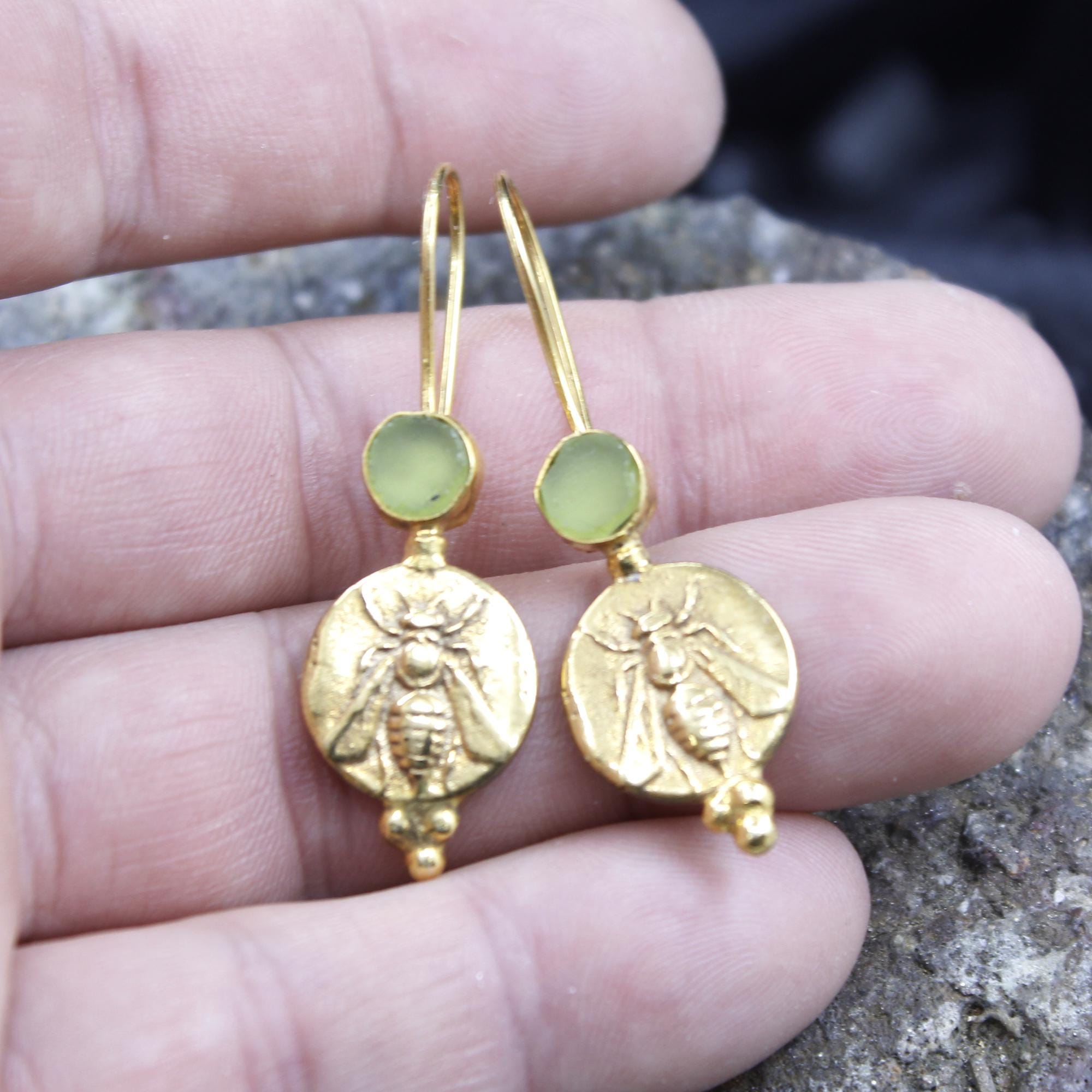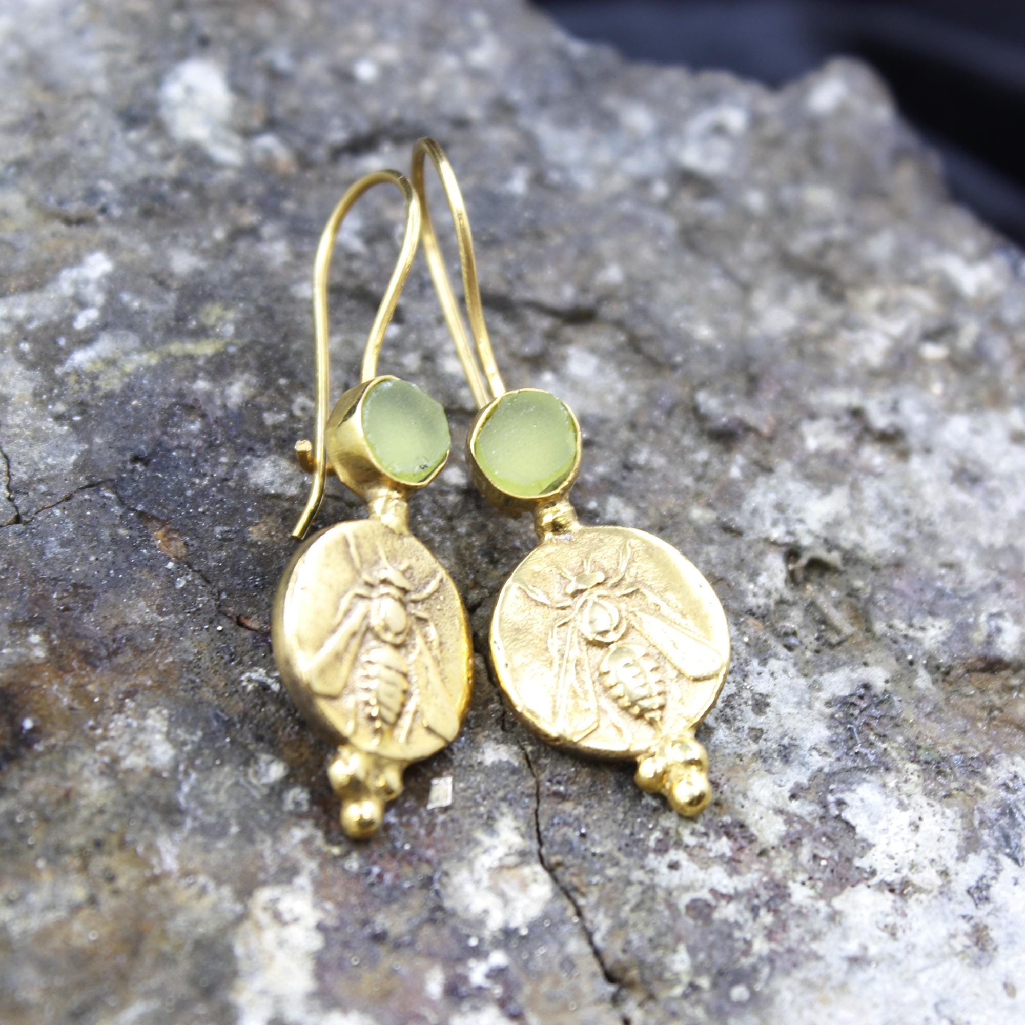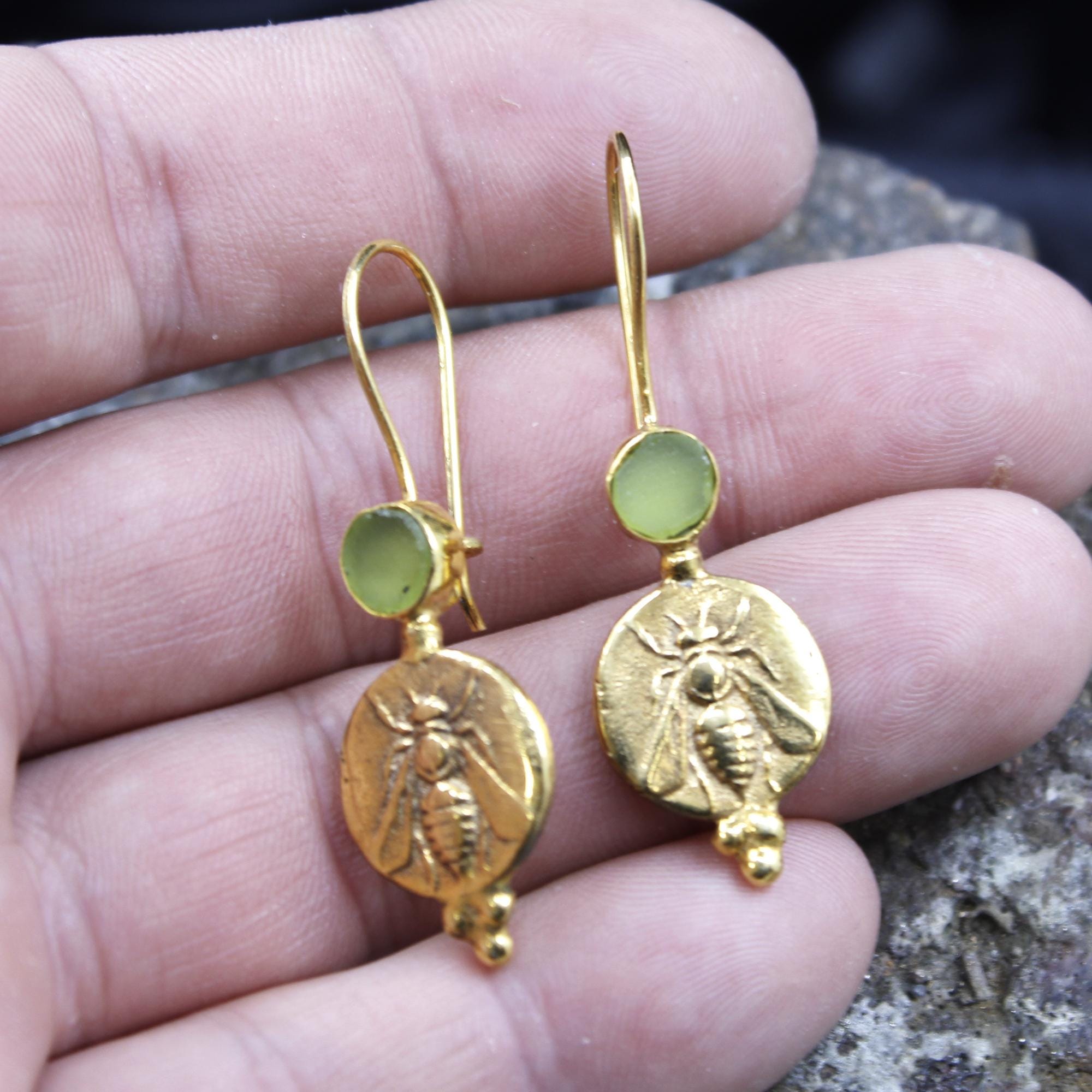 Embrace nature’s charm with these exquisite Bronze Honey Bee Intaglio Earrings, featuring delicately carved bee motifs paired with natural raw Apatite gemstones. Each piece is handcrafted with care in 24K gold vermeil over solid 925k sterling silver — blending elegance, symbolism, and artisan craftsmanship.