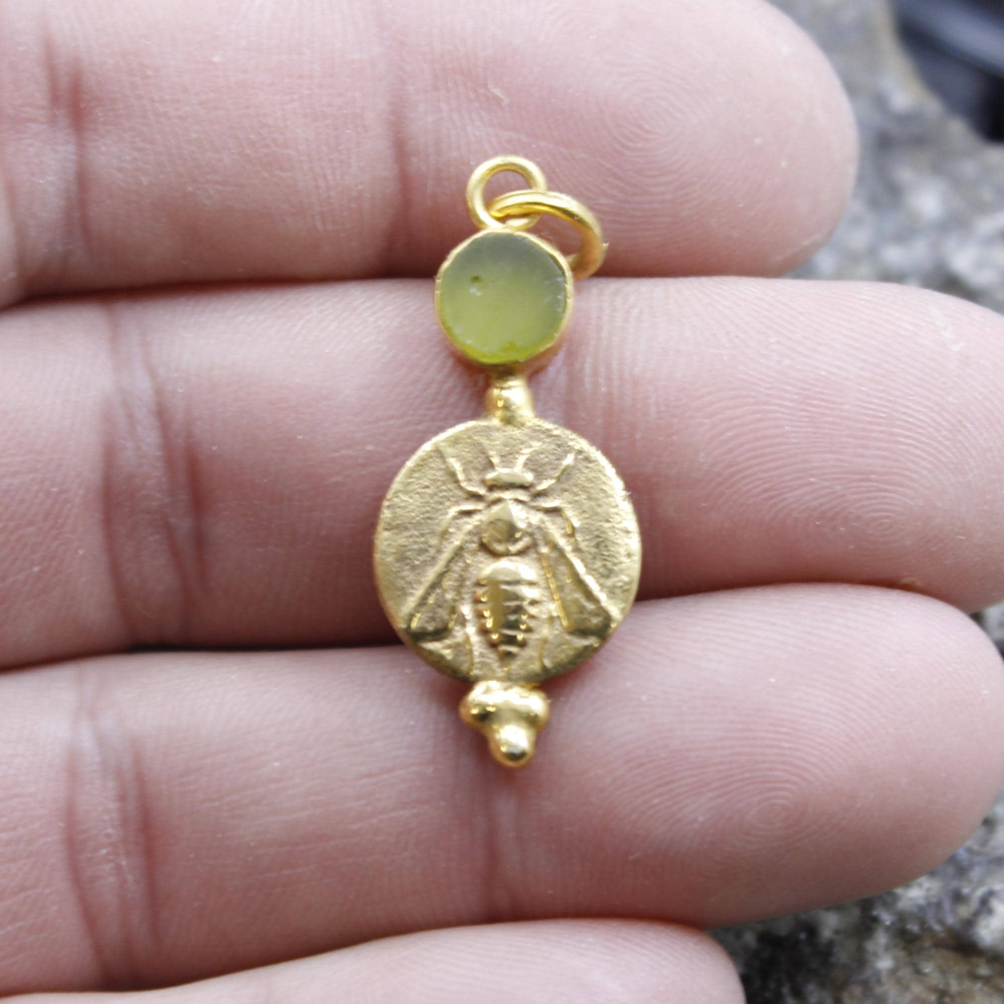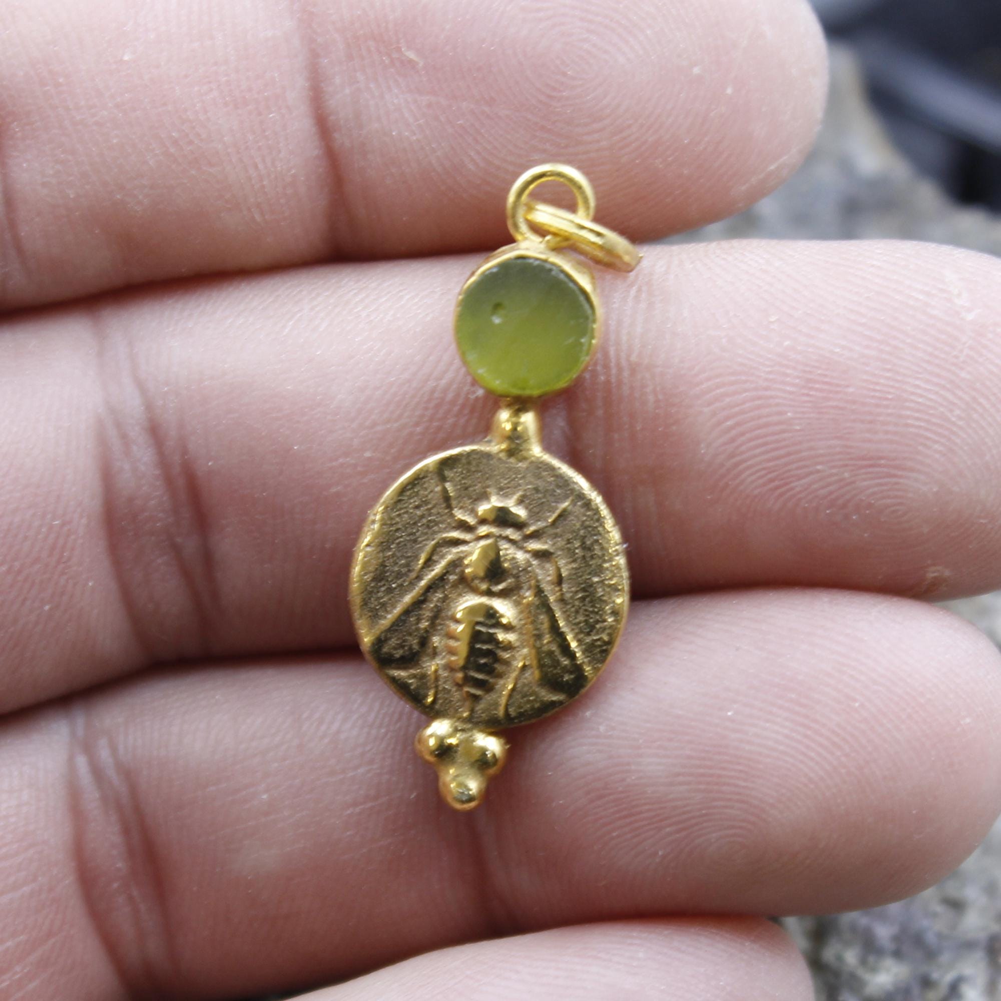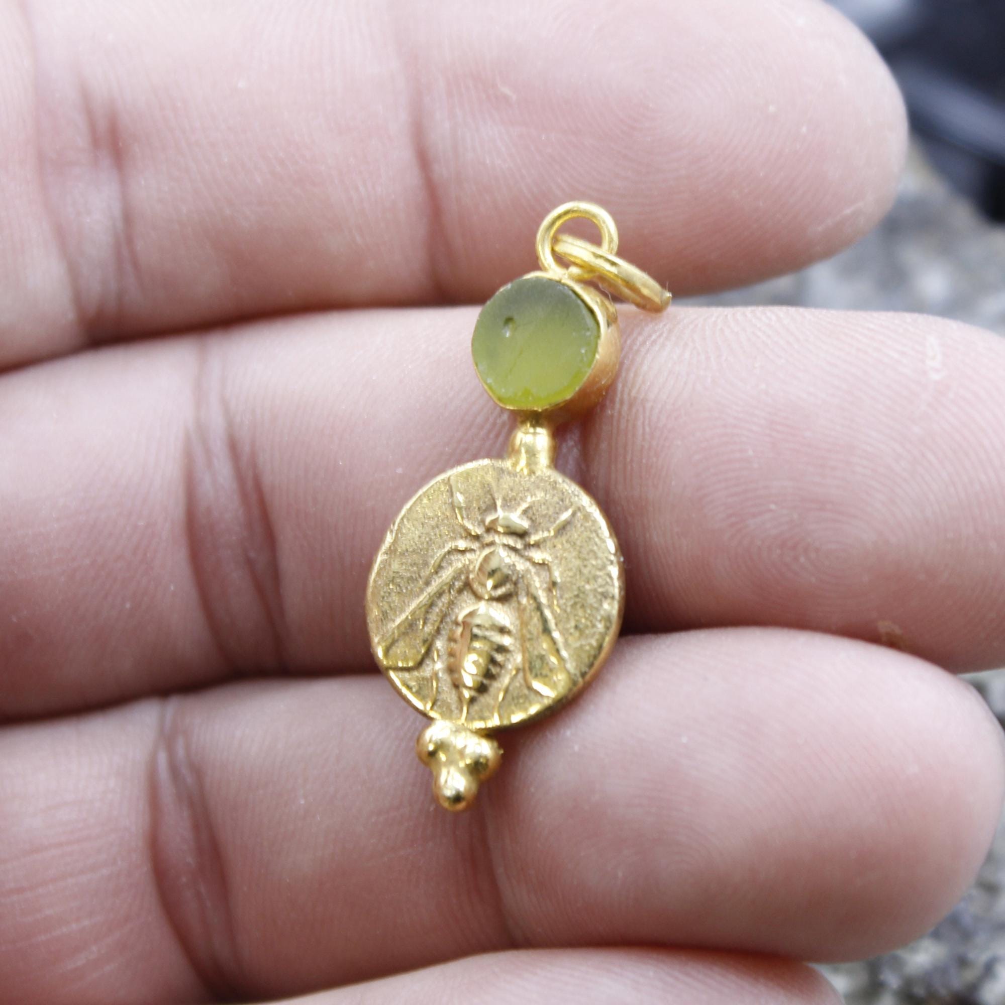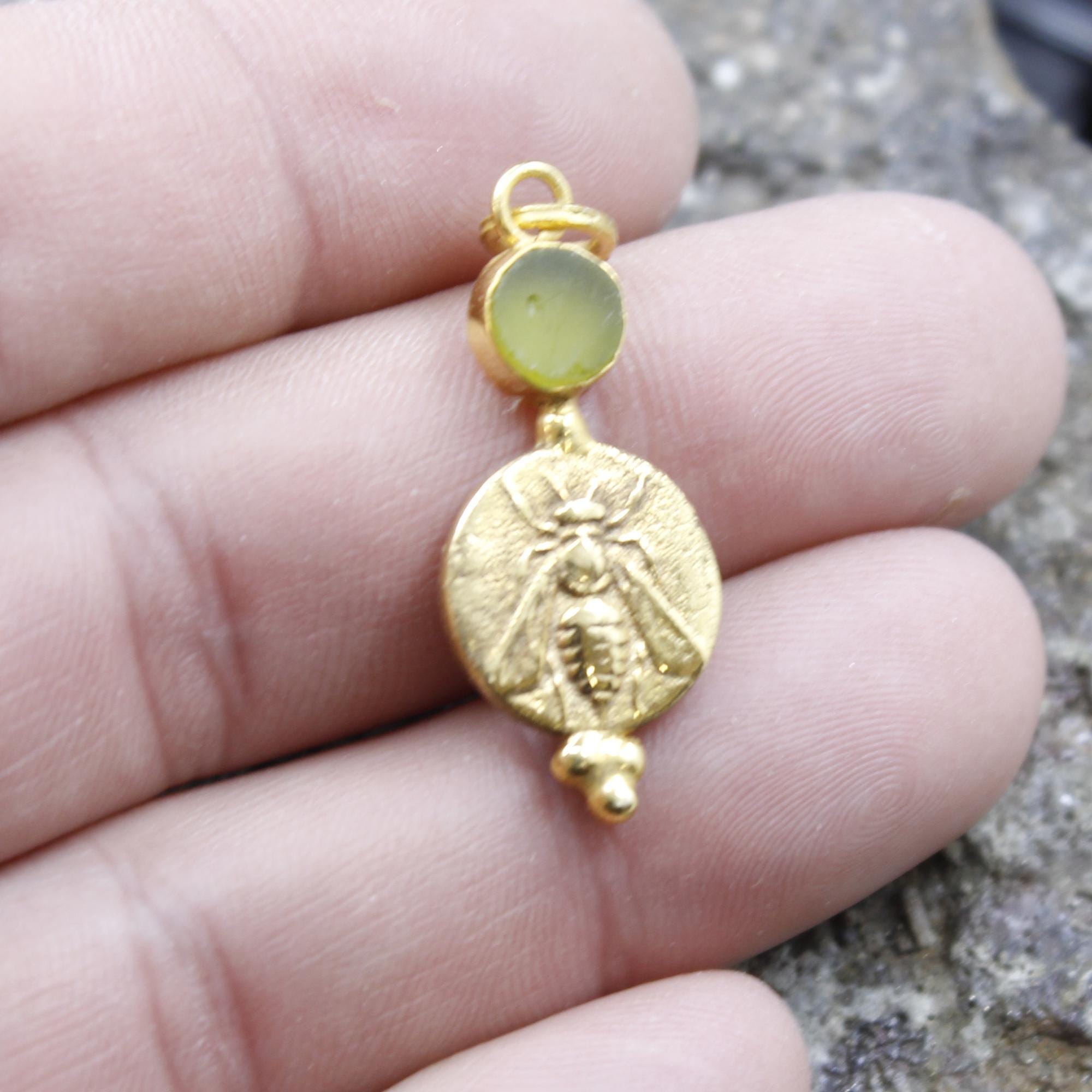 Gold Vermeil Honey Bee Intaglio Pendant with Natural Raw Apatite: Bronze Coin, Sterling Silver