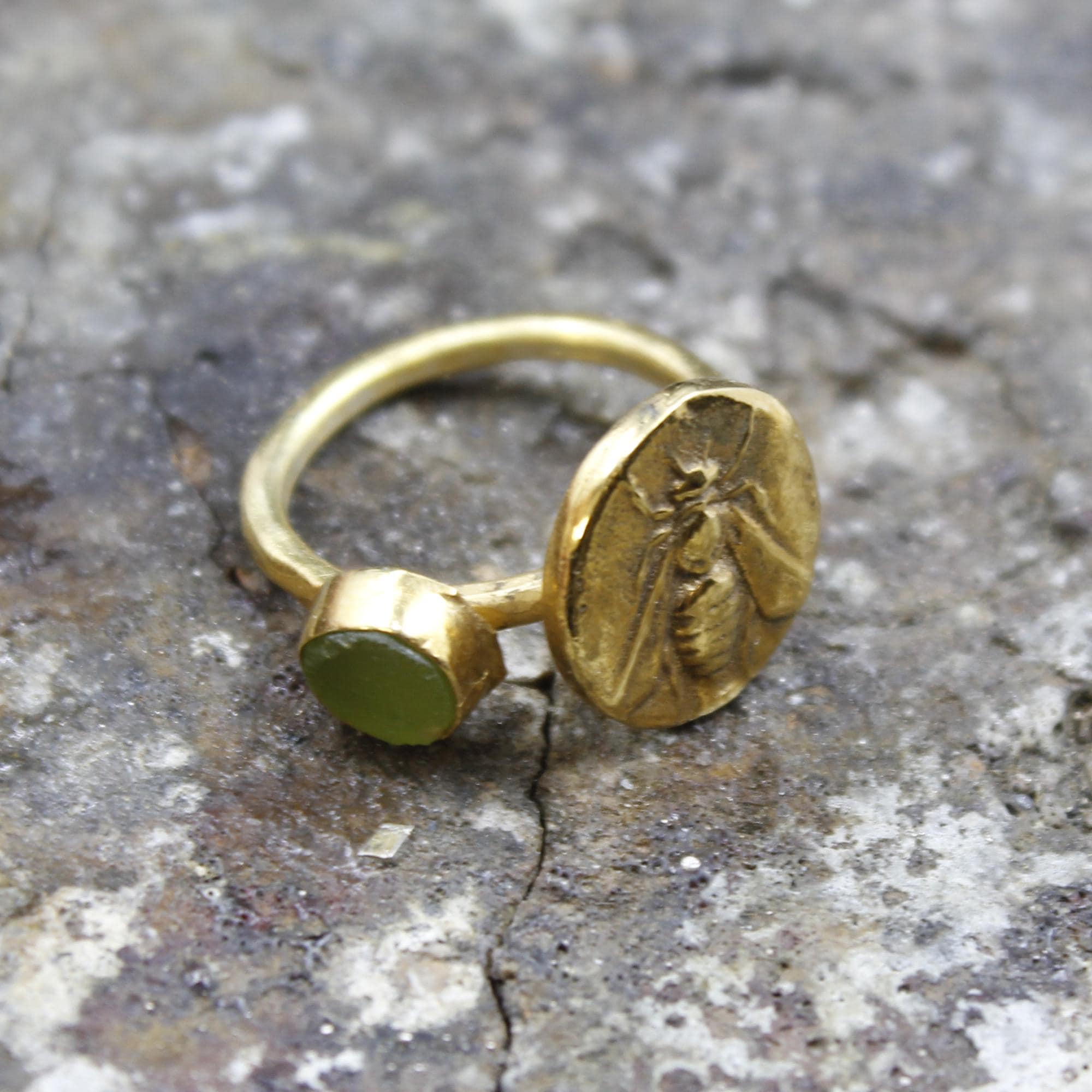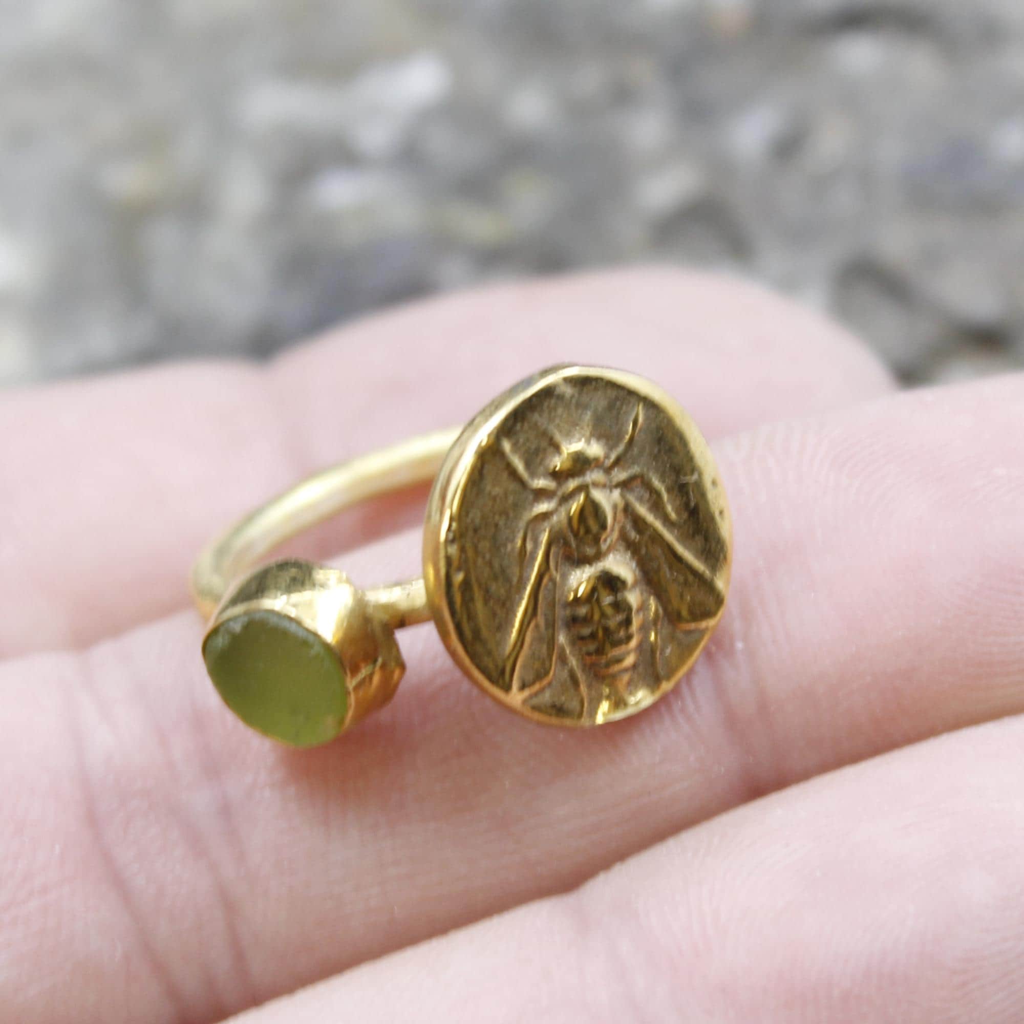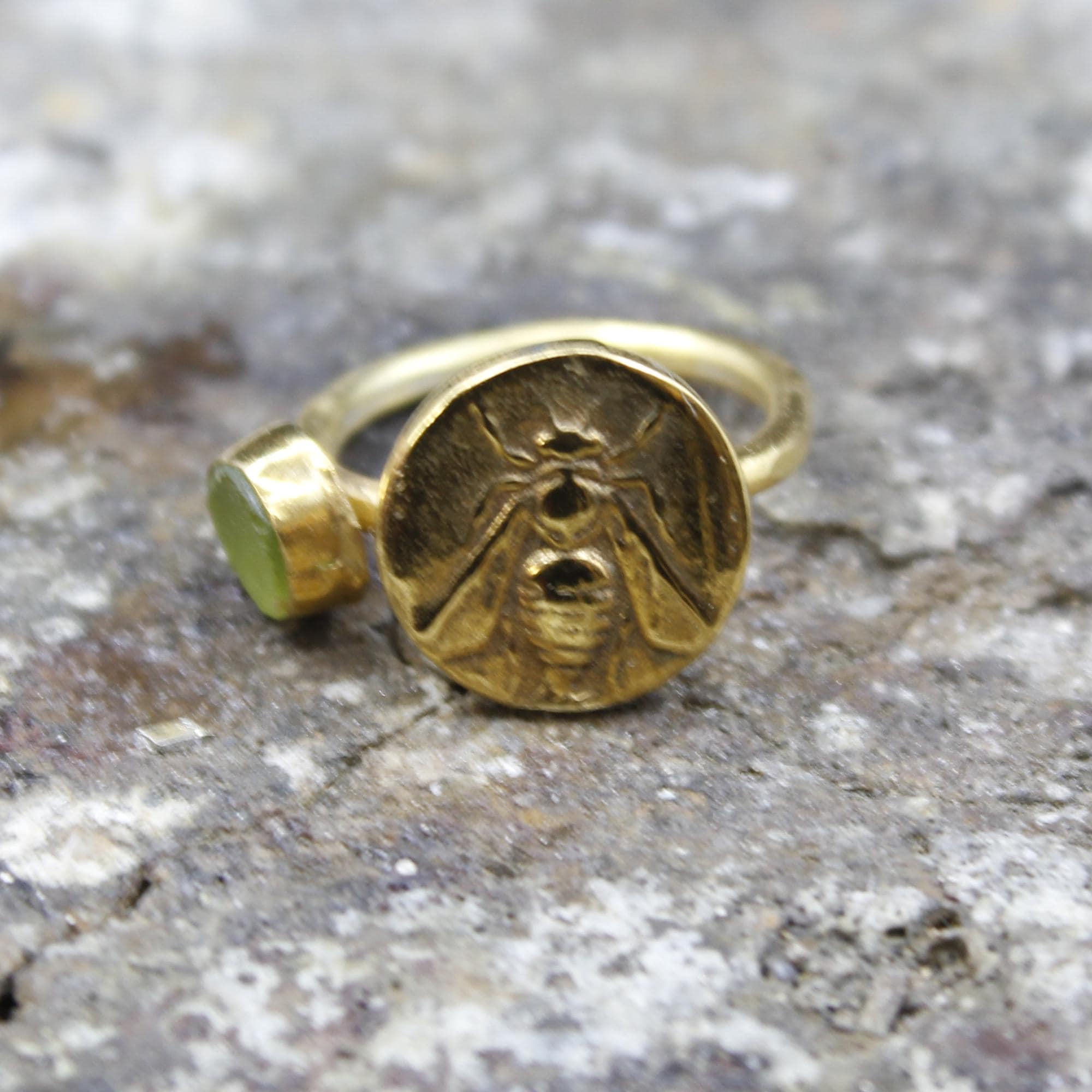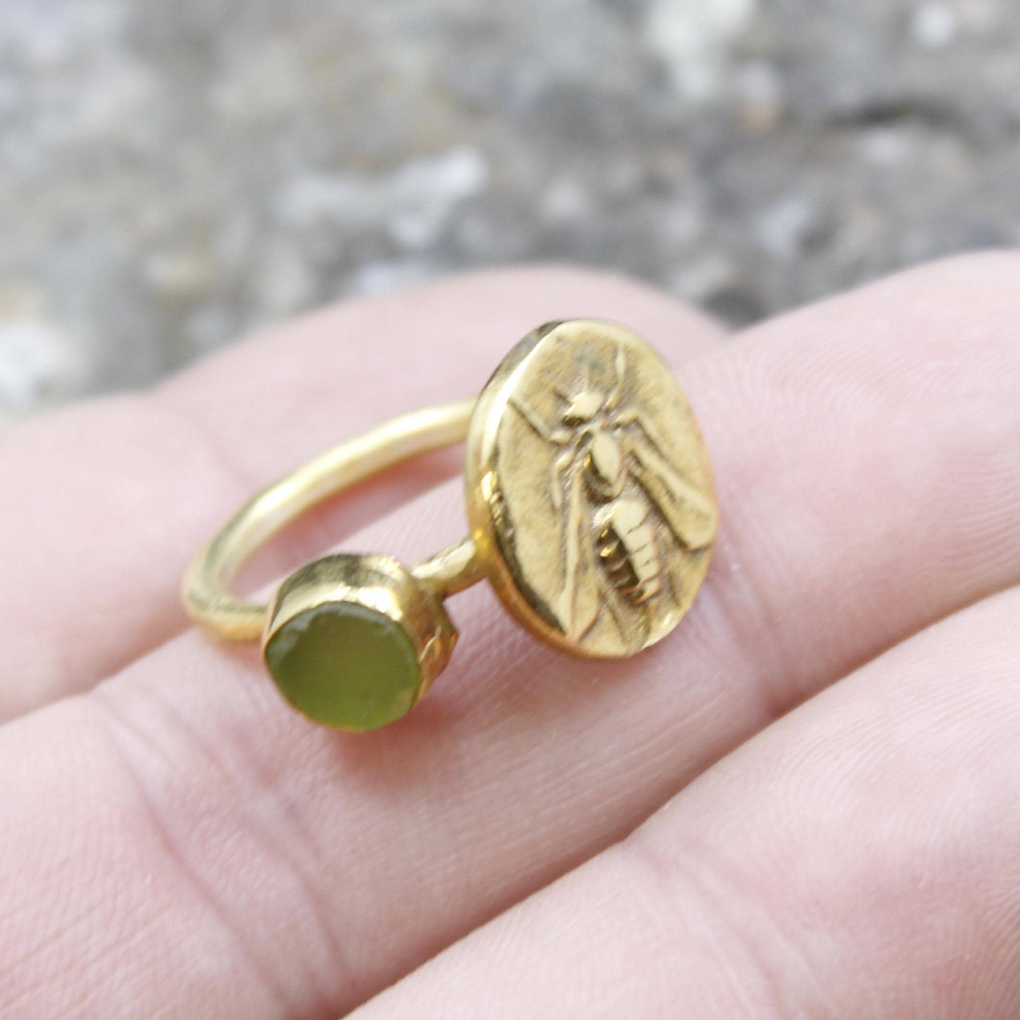 🐝 Handmade Bronze Intaglio Bee Ring with Natural Raw Apatite 24K Gold Vermeil over 925k Sterling Silver | Artisan Crafted Jewelry