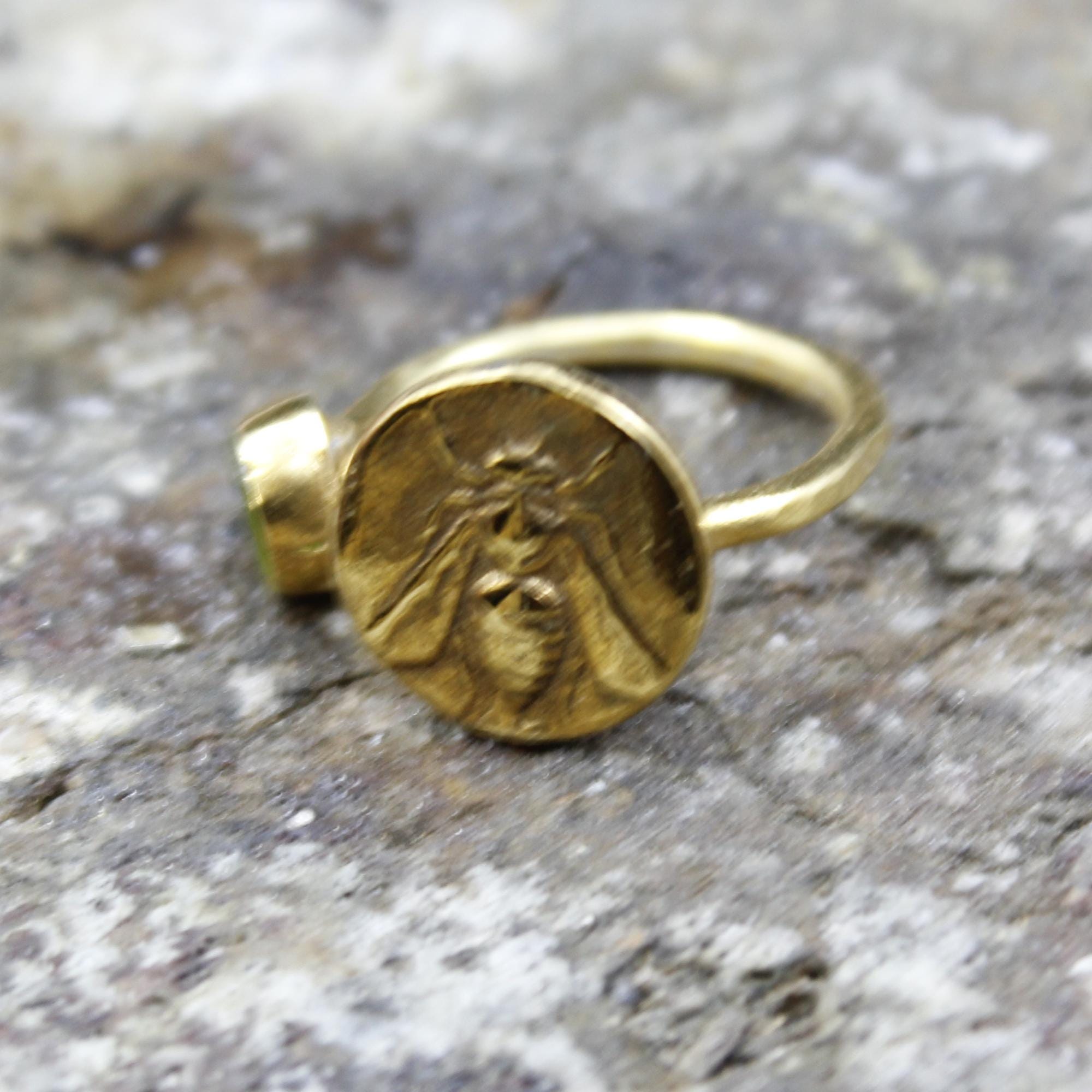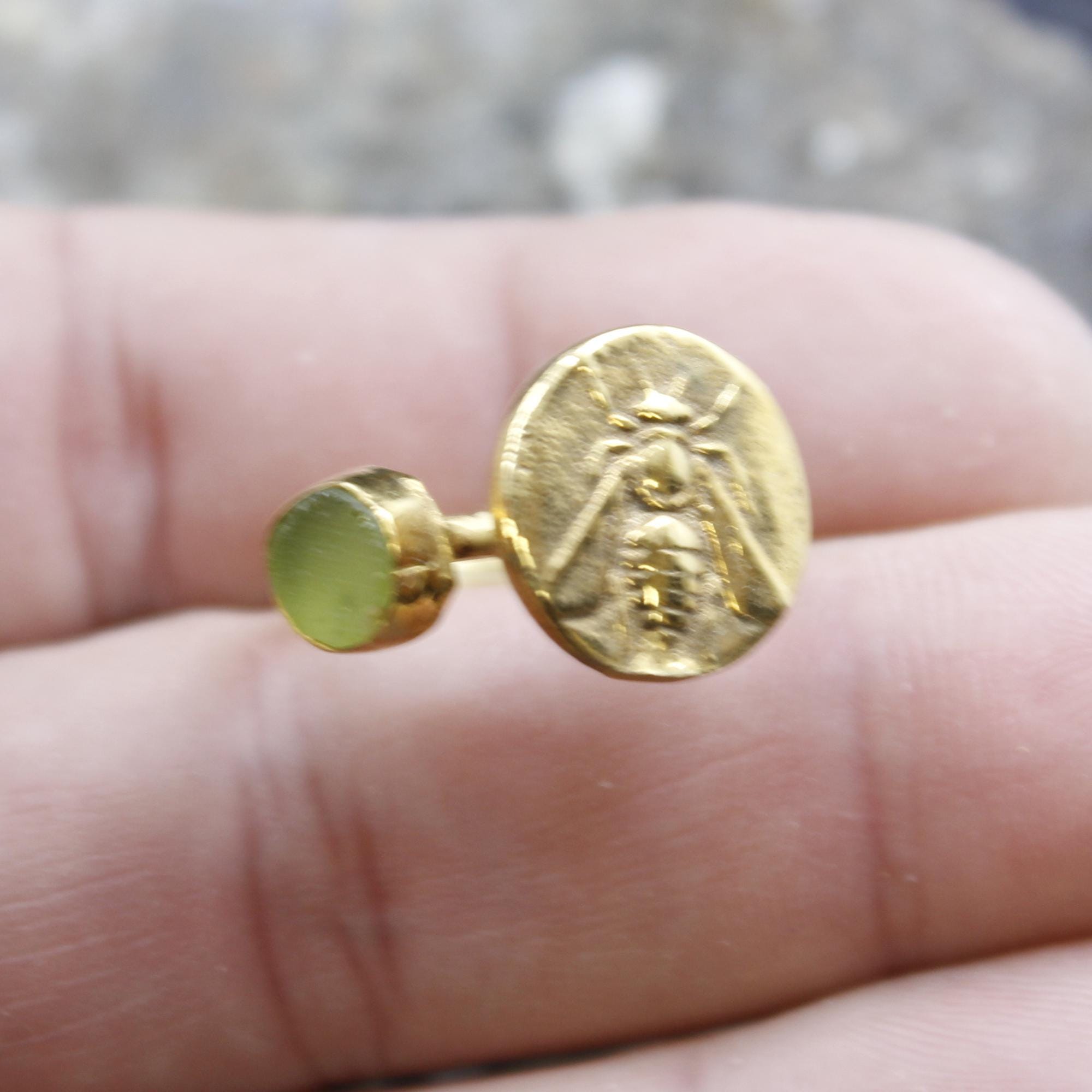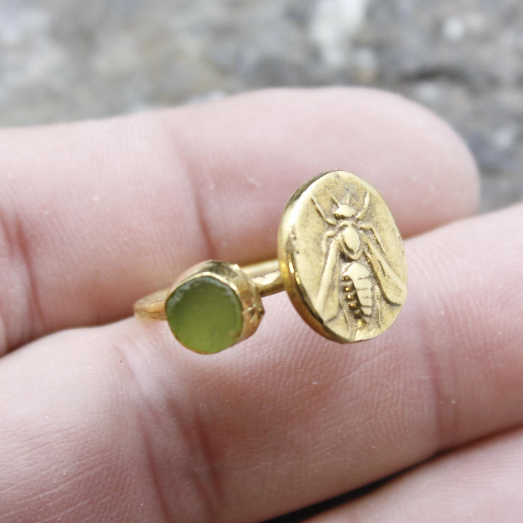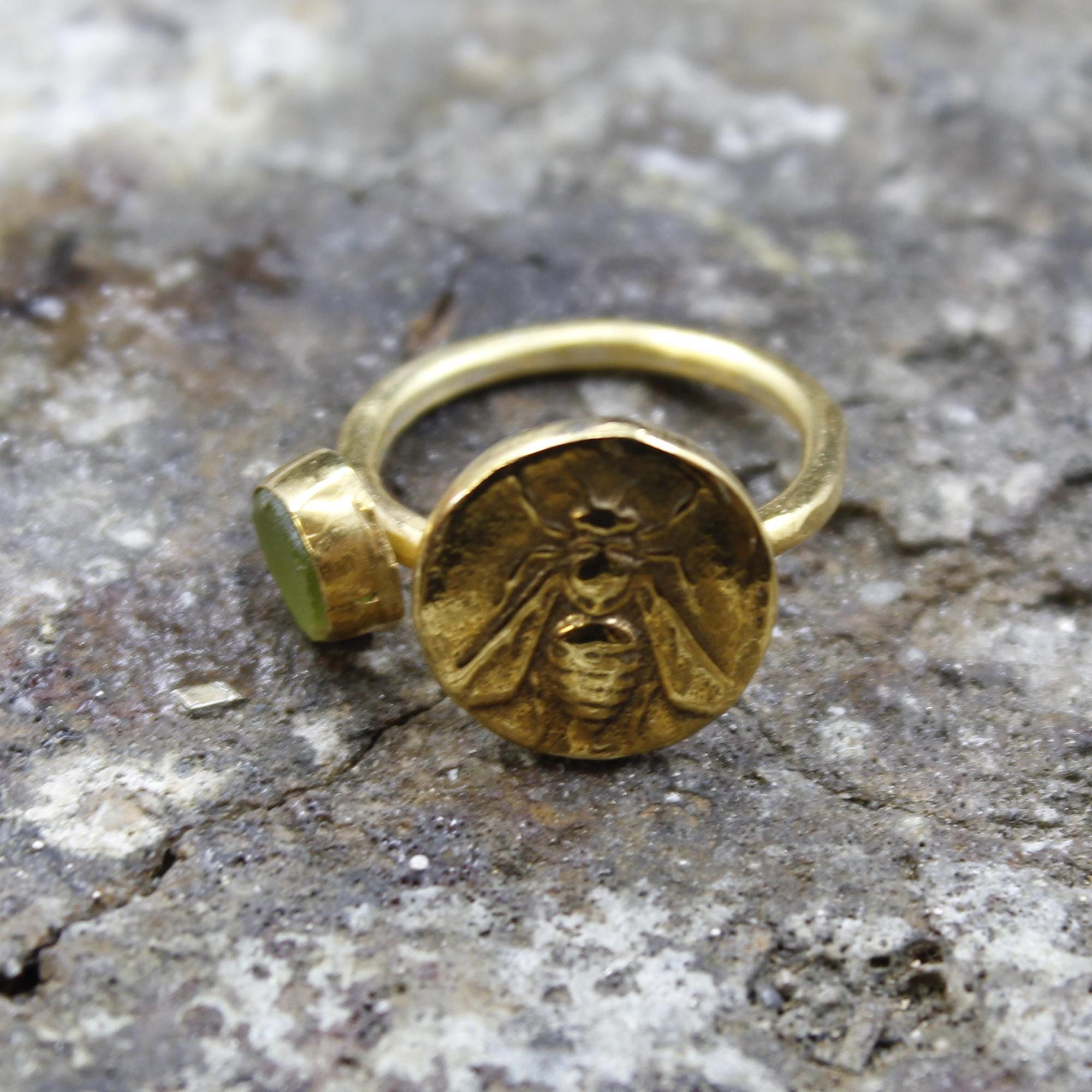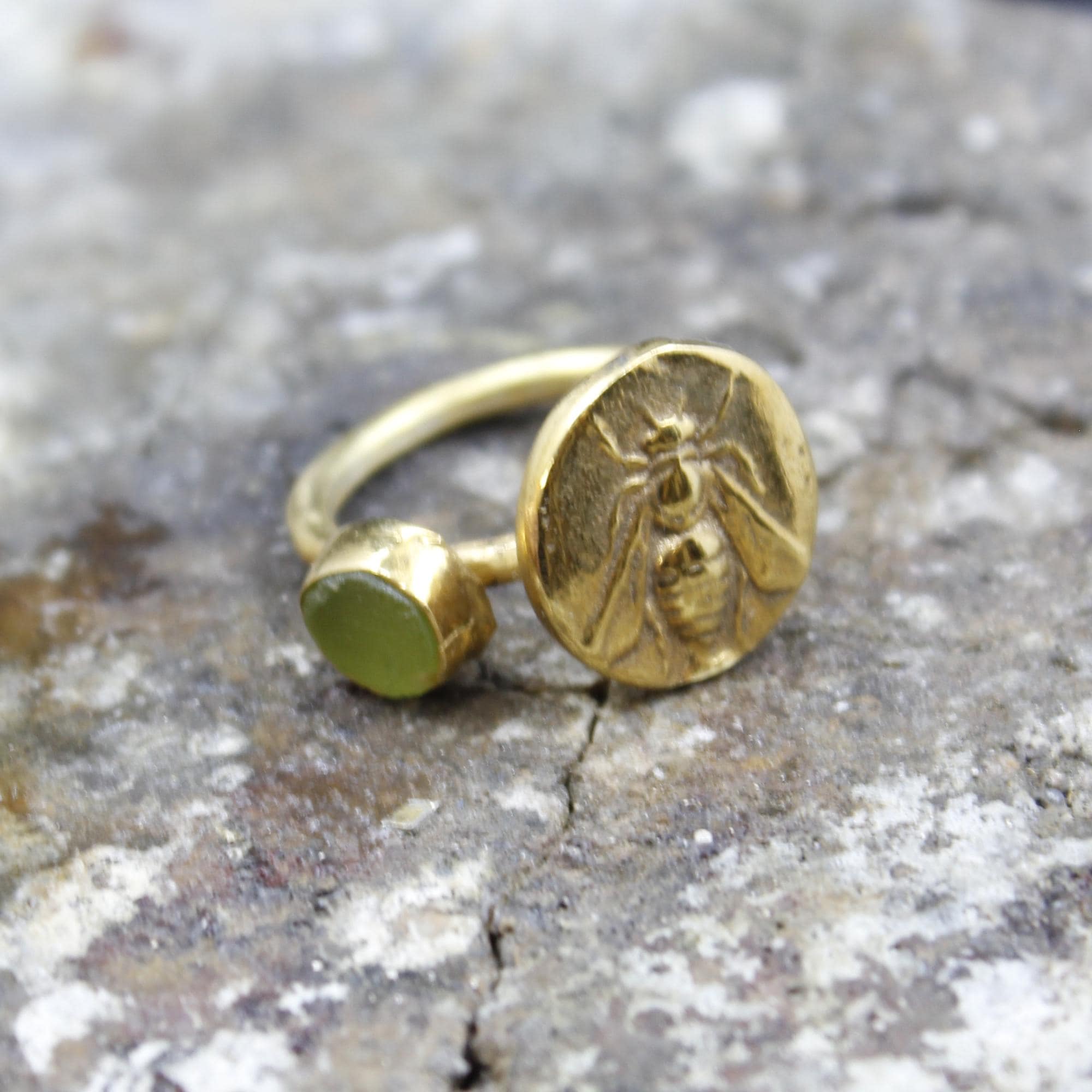 🐝 Handmade Bronze Intaglio Bee Ring with Natural Raw Apatite 24K Gold Vermeil over 925k Sterling Silver | Artisan Crafted Jewelry
