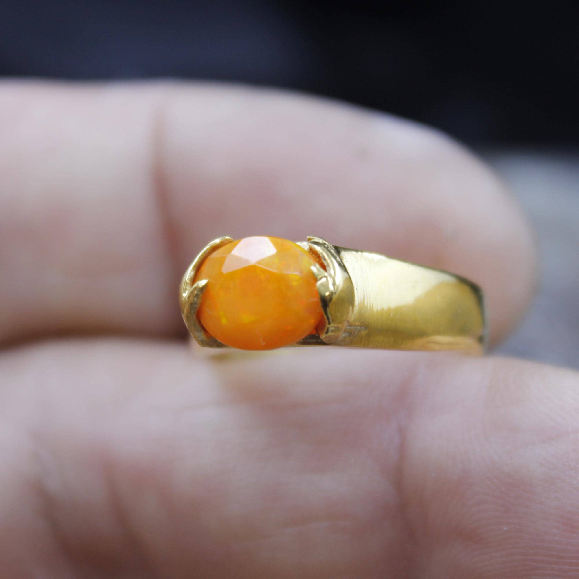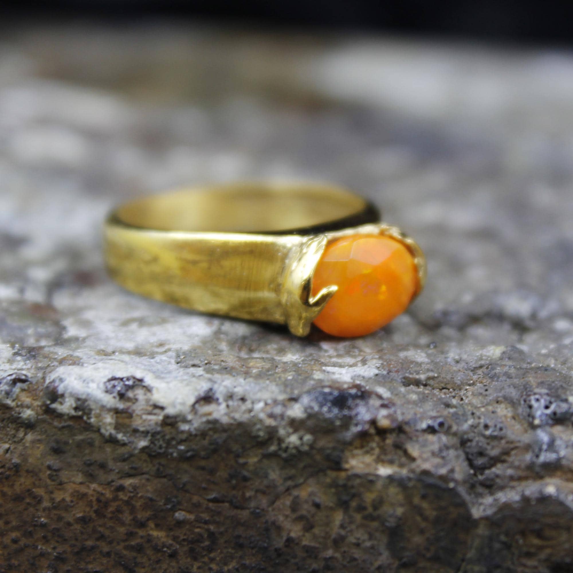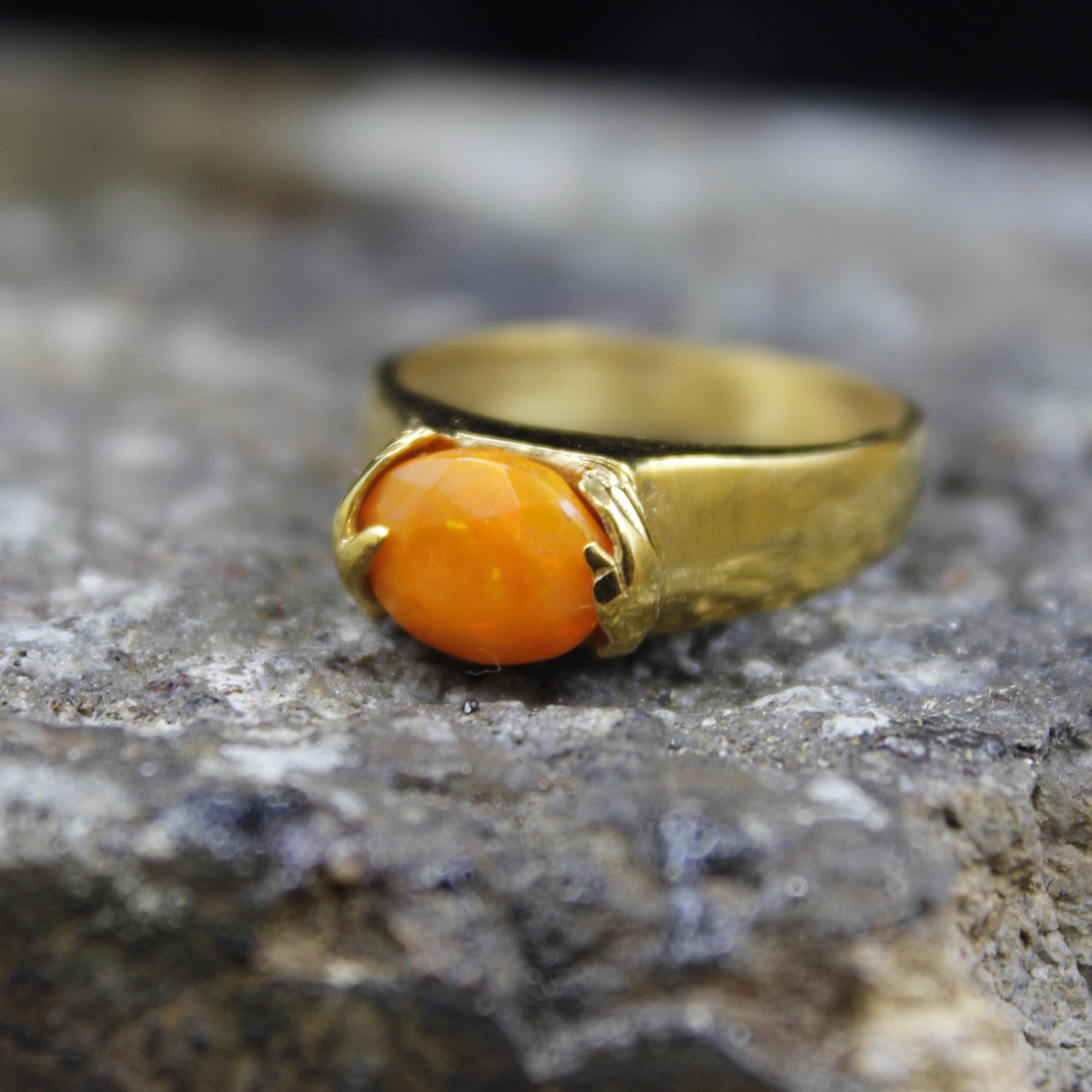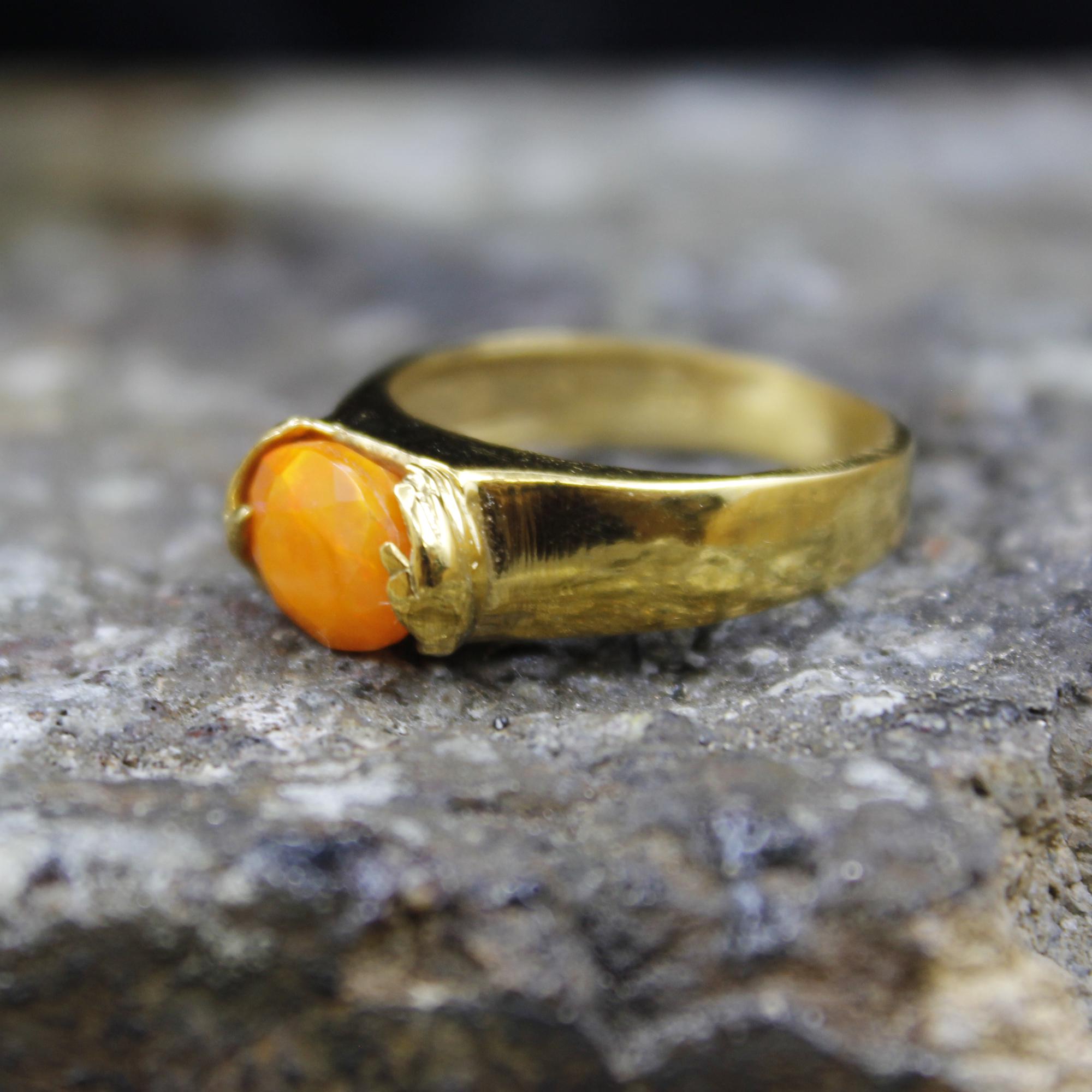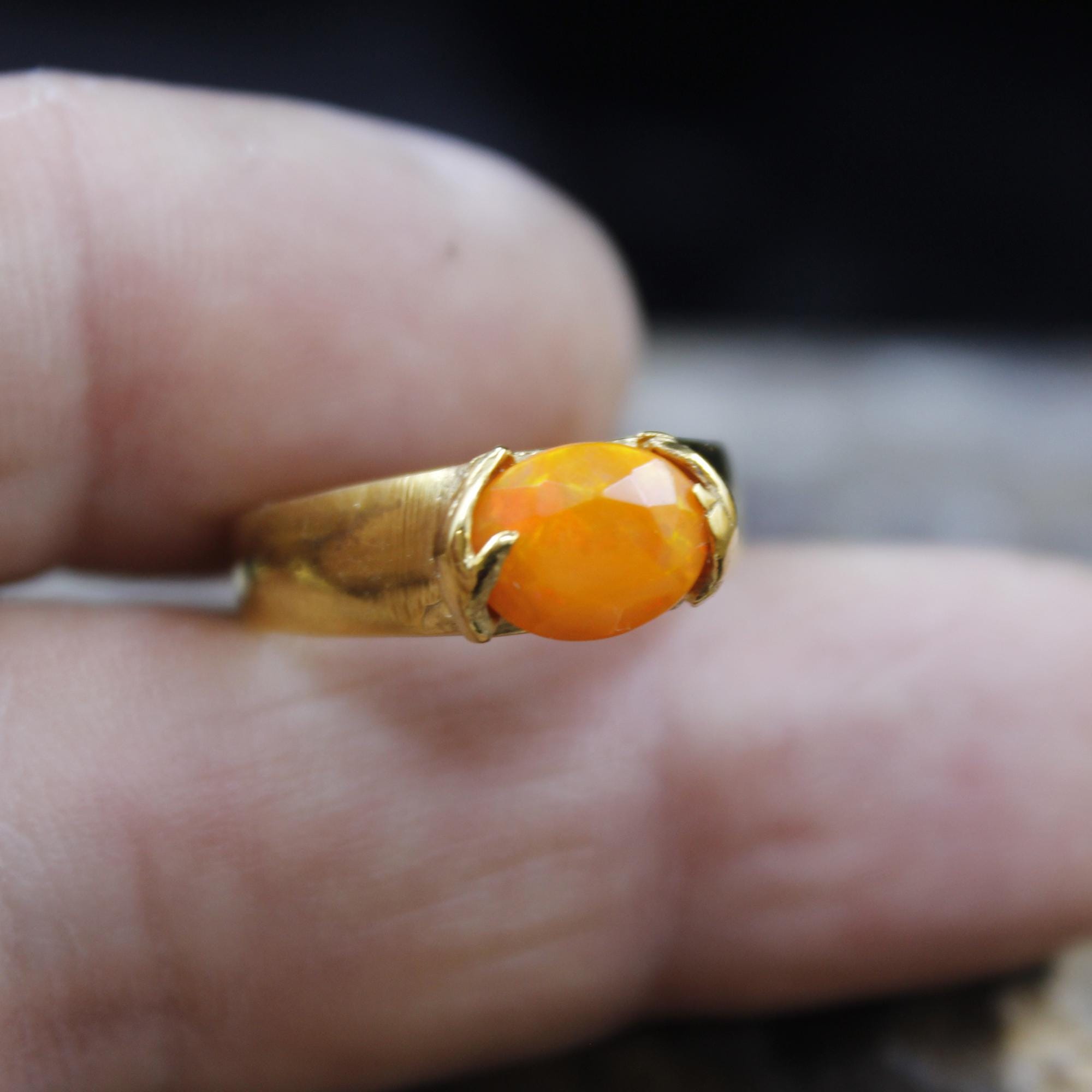 Brighten your look with this stunning Handmade Natural Orange Fire Opal Ring, crafted in a luxurious 24K Gold over Sterling Silver setting. Each piece is individually designed and completely handcrafted, making every ring truly unique.