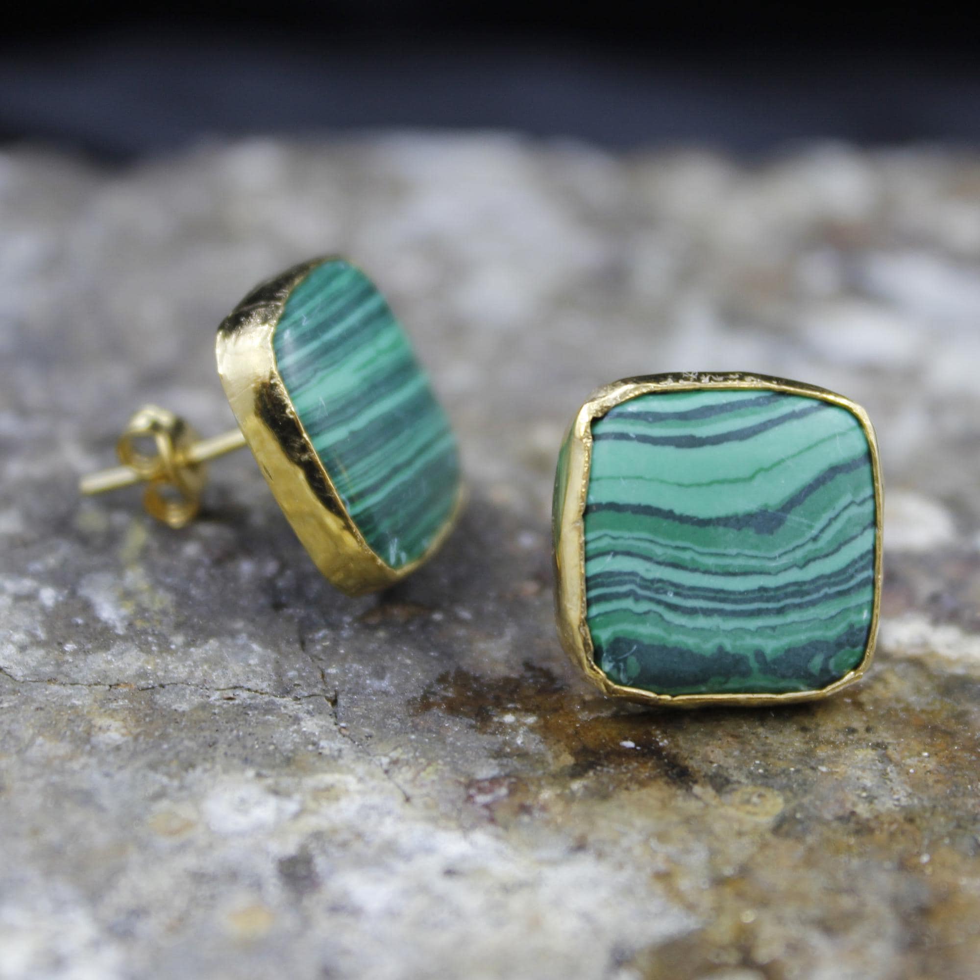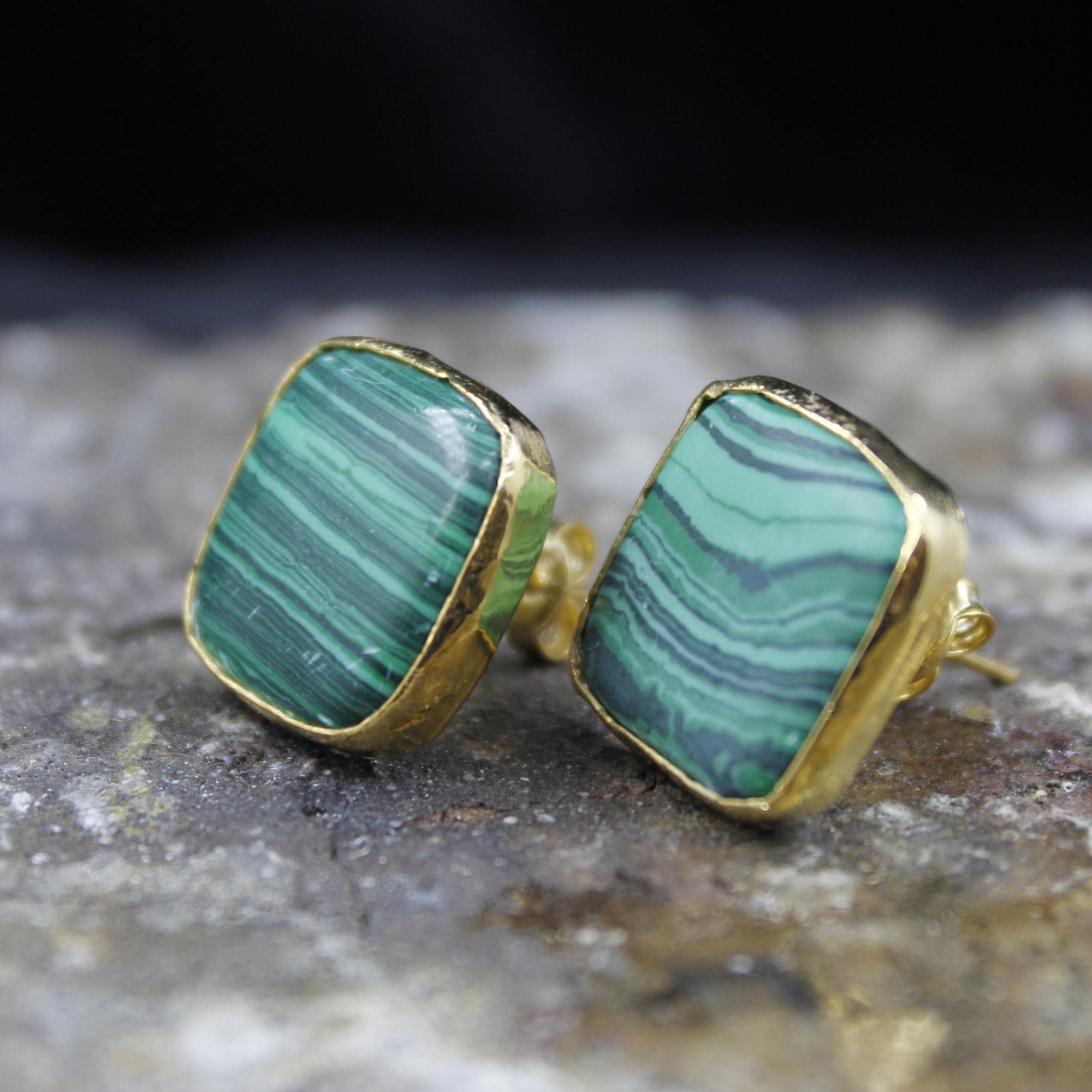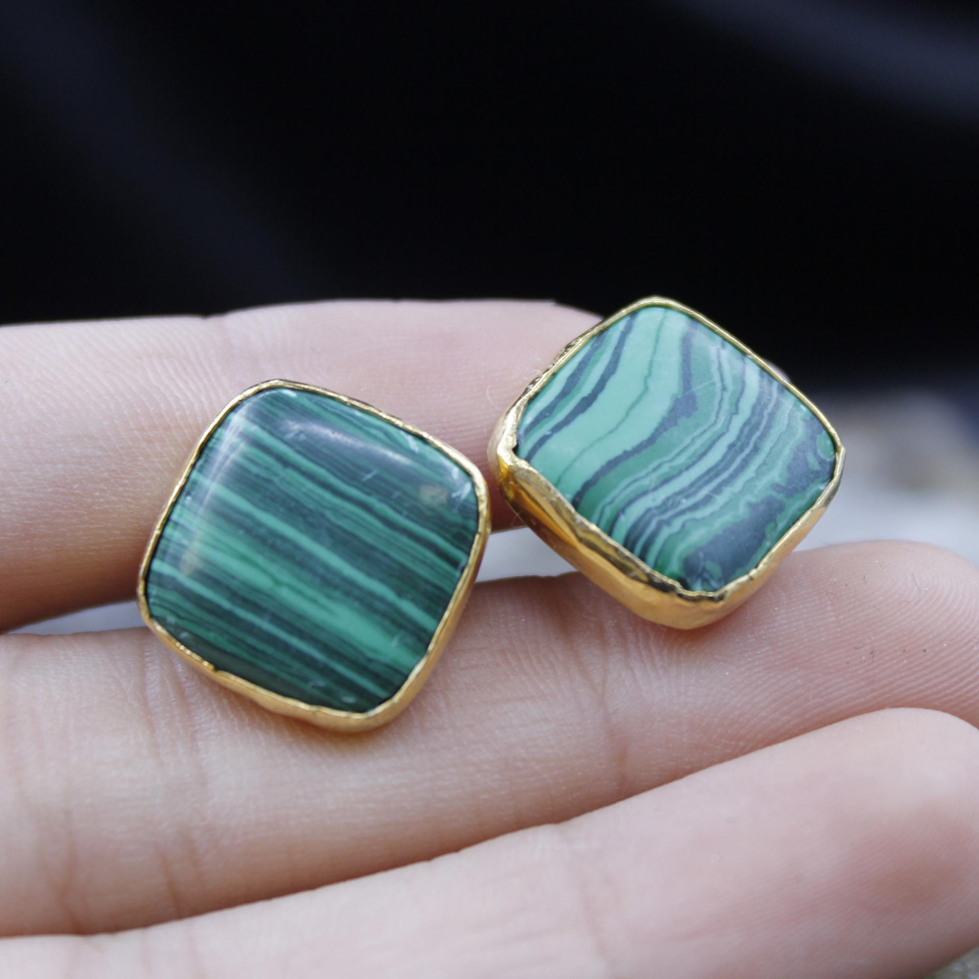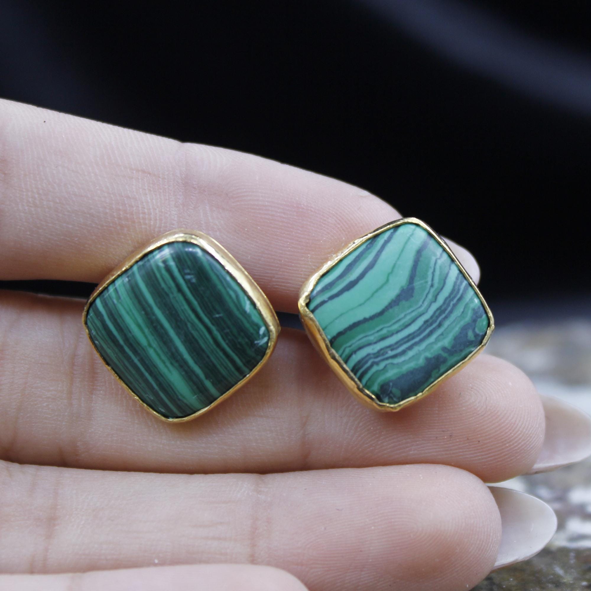 Elevate your everyday look with these stunning Malachite Stud Earrings, hand-crafted with premium materials and timeless style. Each earring features a beautifully rich, natural malachite stone set in luxurious 24K gold vermeil over solid sterling silver — a perfect blend of earthy elegance and radiant shine.
